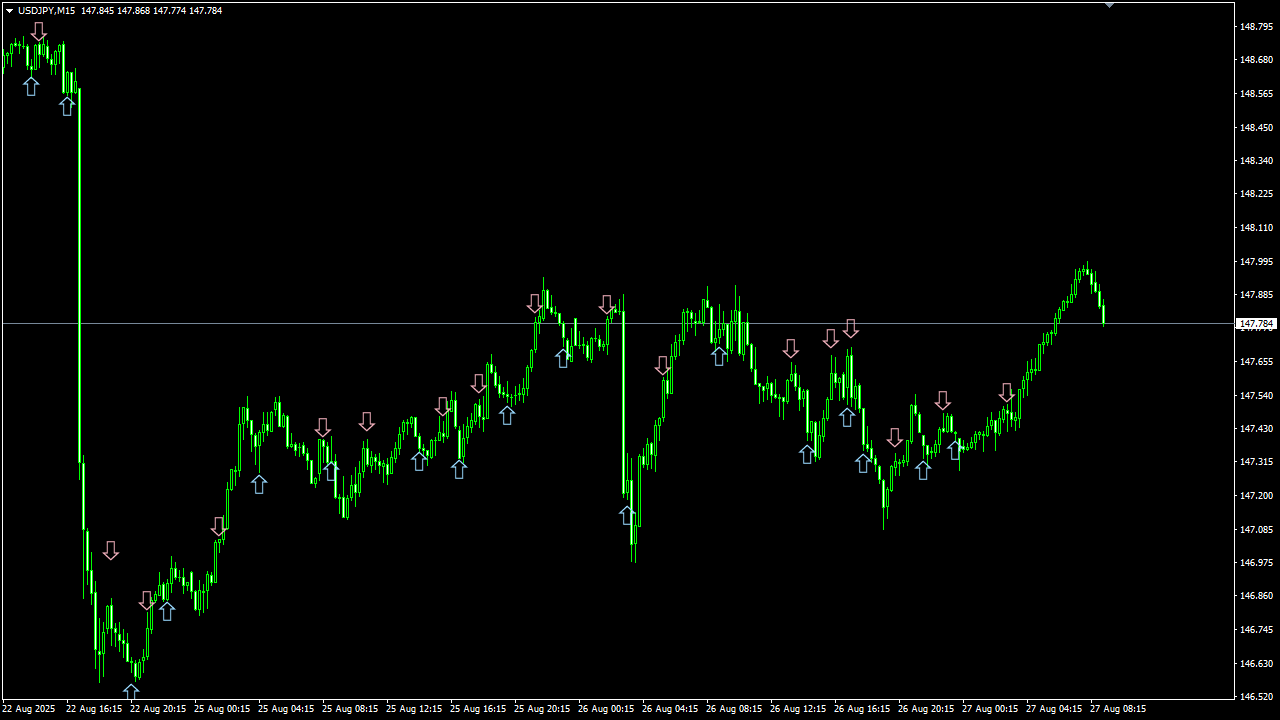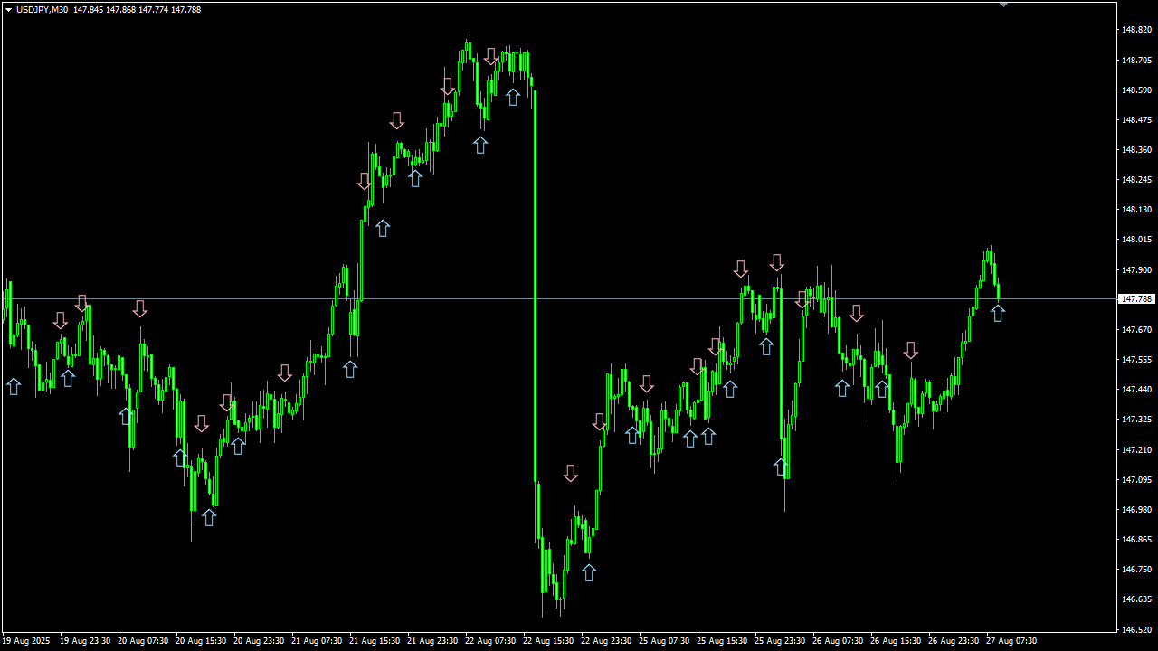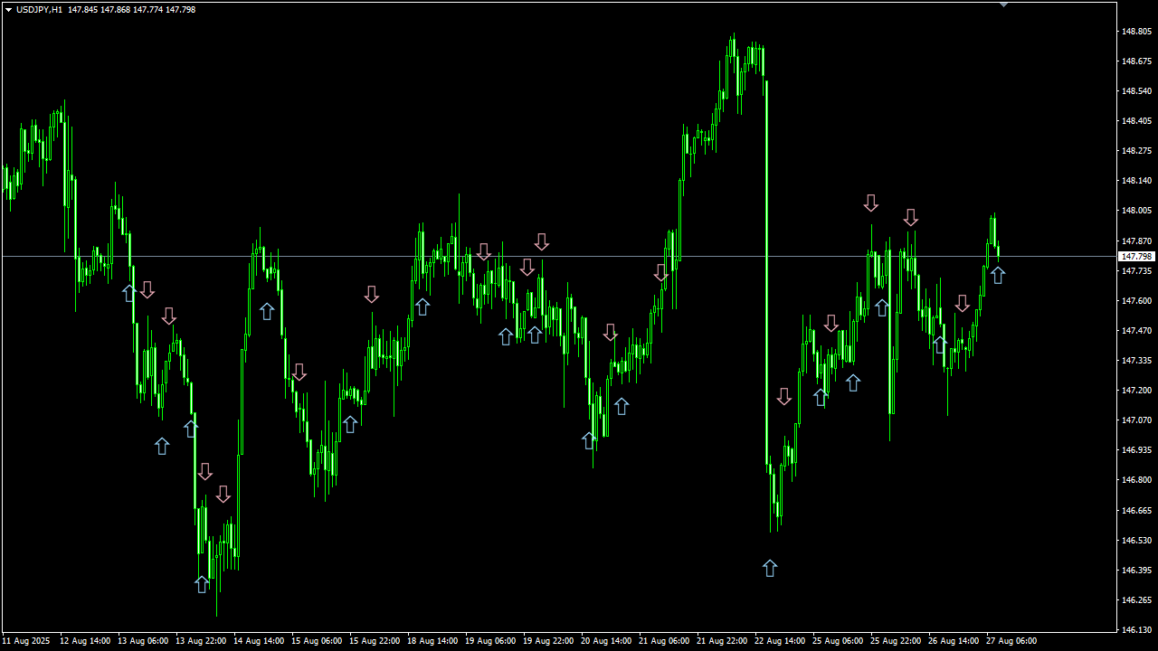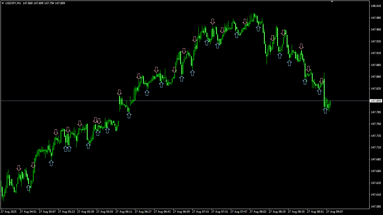 相場は本質的に “波動的構造” を持ち、大小の上下動を繰り返しながら推移します。 この波動は決して完全なランダムではなく、一定の規則性や傾向を内包しており、統計的・数理的アプローチによってその一部を定量的に捉えることが可能です。 私は、この “波動的構造” を計算により抽出し、チャート上に矢印サインとして可視化する技術を確立しました。 さらに、これらのサインを過去データで検証することで、相場予測ツールとしての再現性と有効性を科学的に証明しています。 なお、実際の運用方法については後ほど詳しくご説明いたします。