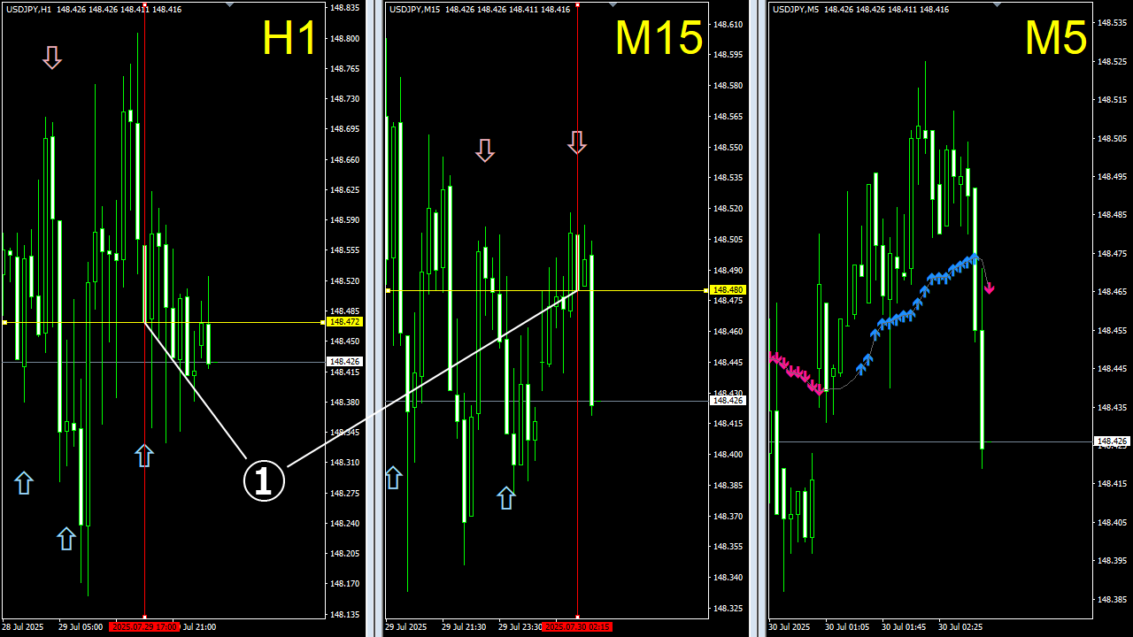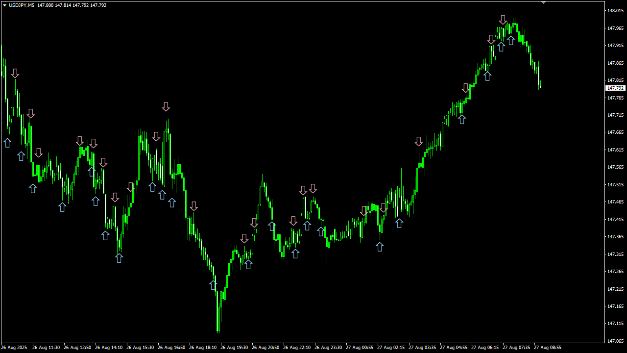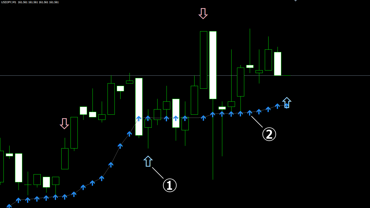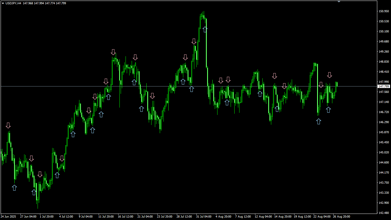 相場は本質的に “波動的構造” を持ち、大小の上下動を繰り返しながら推移します。 この波動は決して完全なランダムではなく、一定の規則性や傾向を内包しており、統計的・数理的アプローチによってその一部を定量的に捉えることが可能です。 私は、この “波動的構造” を計算により抽出し、チャート上に矢印サインとして可視化する技術を確立しました。 さらに、これらのサインを過去データで検証することで、相場予測ツールとしての再現性と有効性を科学的に証明しています。 なお、実際の運用方法については後ほど詳しくご説明いたします。