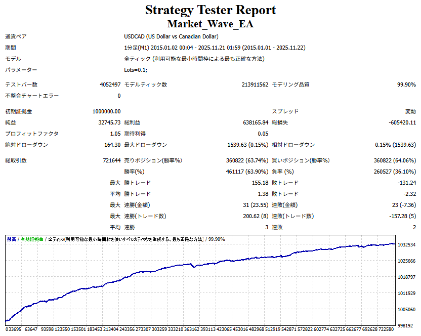 ただし、1分足に関しては、1通貨ペアだけでもバックテストの取引数が80万件を超えるため、MT4 のメモリ制限でバックテストが停止してしまう問題があり、1分足のバックテストのみ2015年以降に期間を制限して検証を行いました。