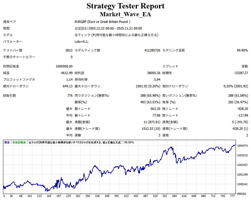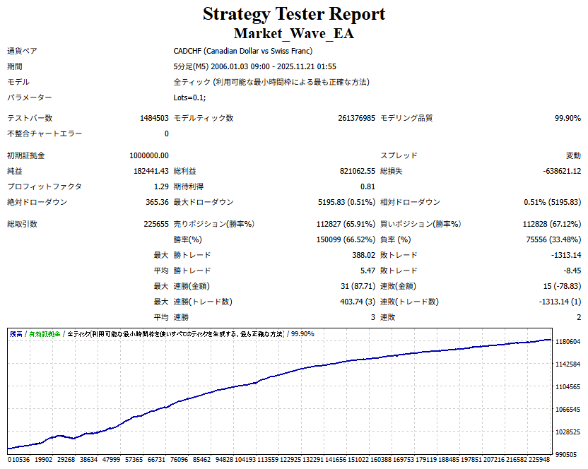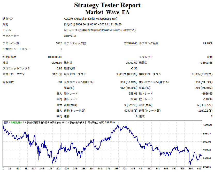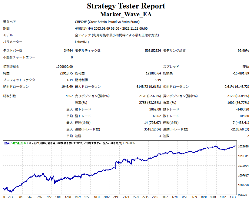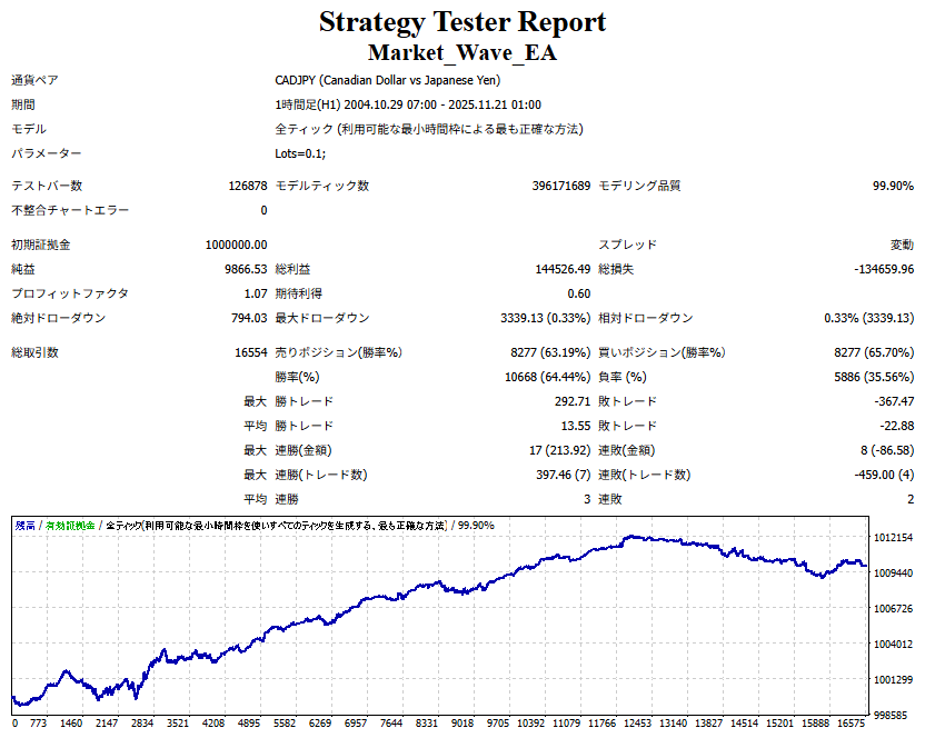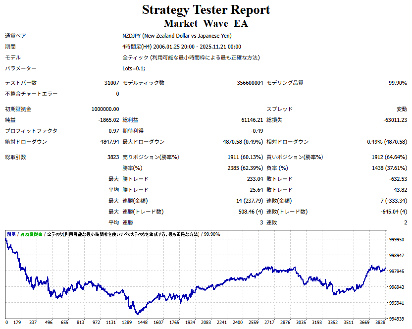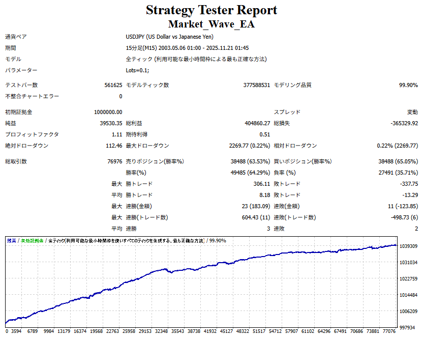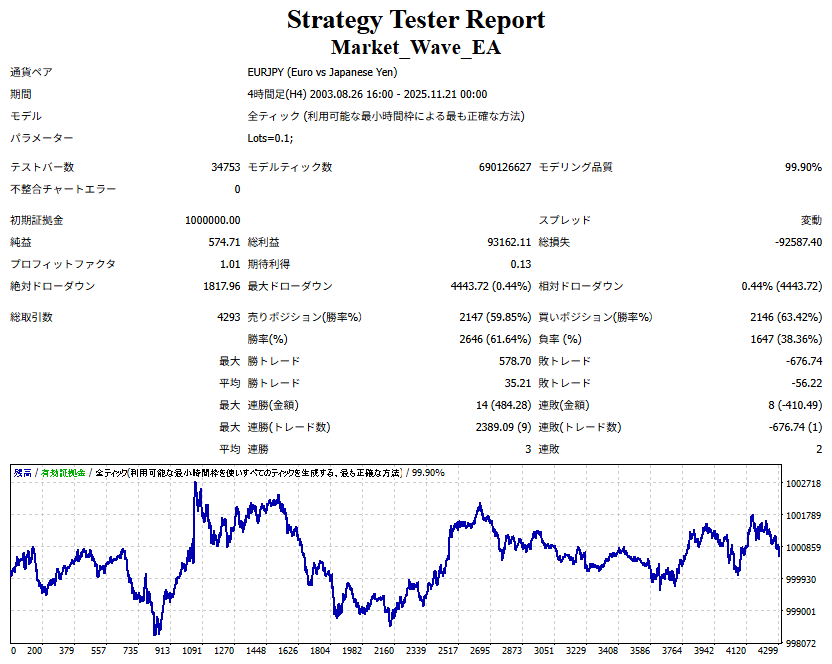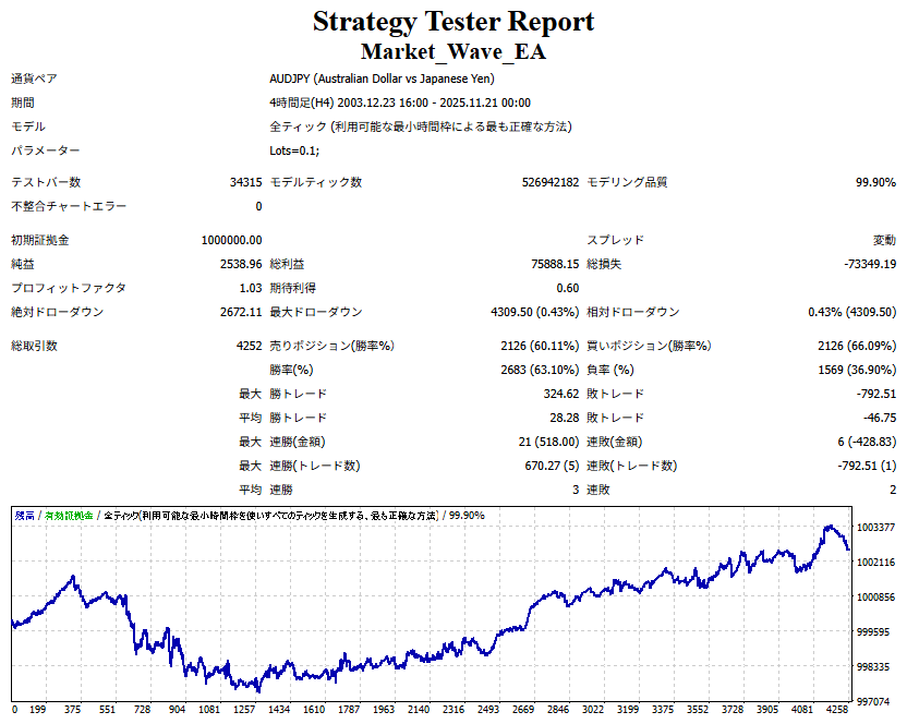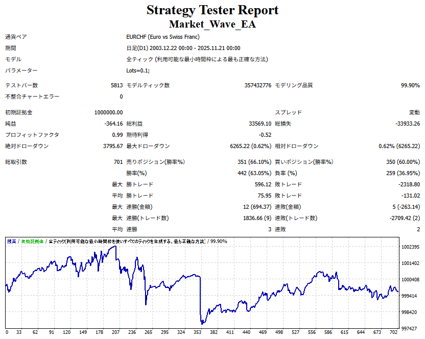 ● 実際の運用方法 ● 論より証拠」の項で公開した検証は、スプレッドをほぼゼロに設定して実施したものですので、 実際の運用では、少なくともスプレッドなどのコスト分は利益を伸ばす必要があります。 言い換えれば、そのコスト分だけ利益を伸ばすだけで、安定した取引が期待できるということです。 「それが難しいのでは?」と思われる方もいるかもしれませんが、心配はいりません。 ポイントは── 相場が “波” の方向に逆らっているときは取引をしない、この徹底だけです。 「コスト分の利益を伸ばす」と考えるのではなく、 「負けやすい局面を避けることでコストを浮かせる」と考えていただければ分かりやすいかと思います。