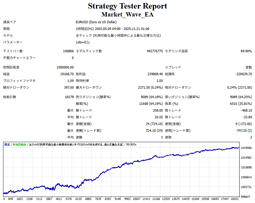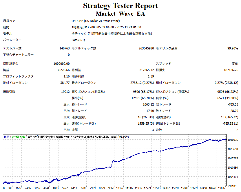 ・ 初動、すなわち最初のサインのみを対象にドテン取引を行った場合のパフォーマンスを出力します。 ・ それ以外の仕様は Market_Wave と同様です。 ② 上記の「パフォーマンスを外部出力する機能」において、出力名を任意に設定できるようにしました。