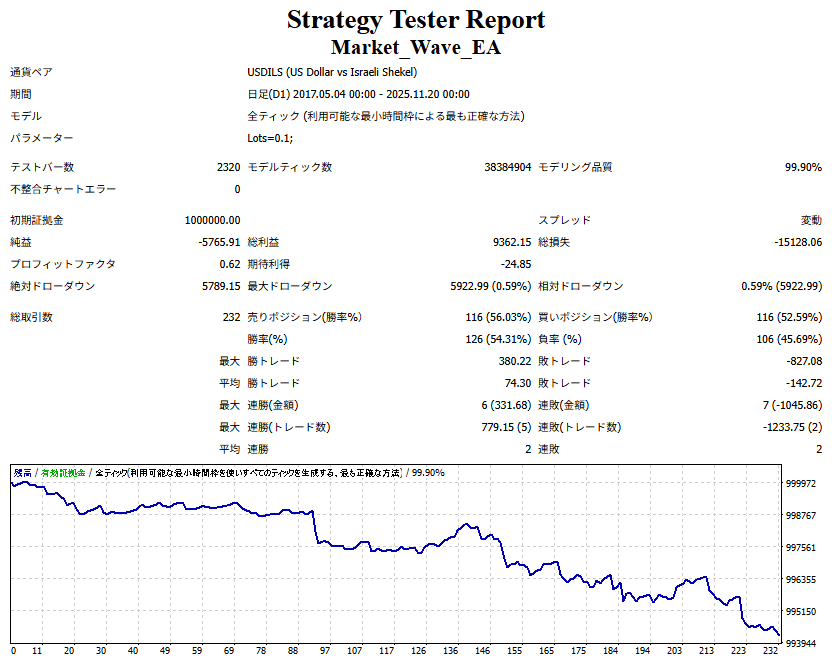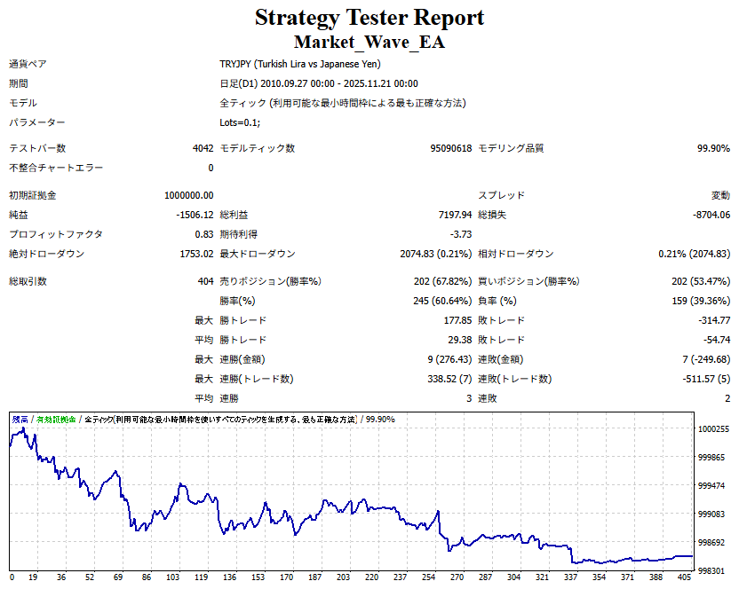 ③ Market_Wave の矢印サインにフィルターを一切加えず、すべての矢印サインの向きを “逆” に表示させ、   すべてのサインをドテン取引した場合のパフォーマンスを計測。(スプレッドは考慮せず)