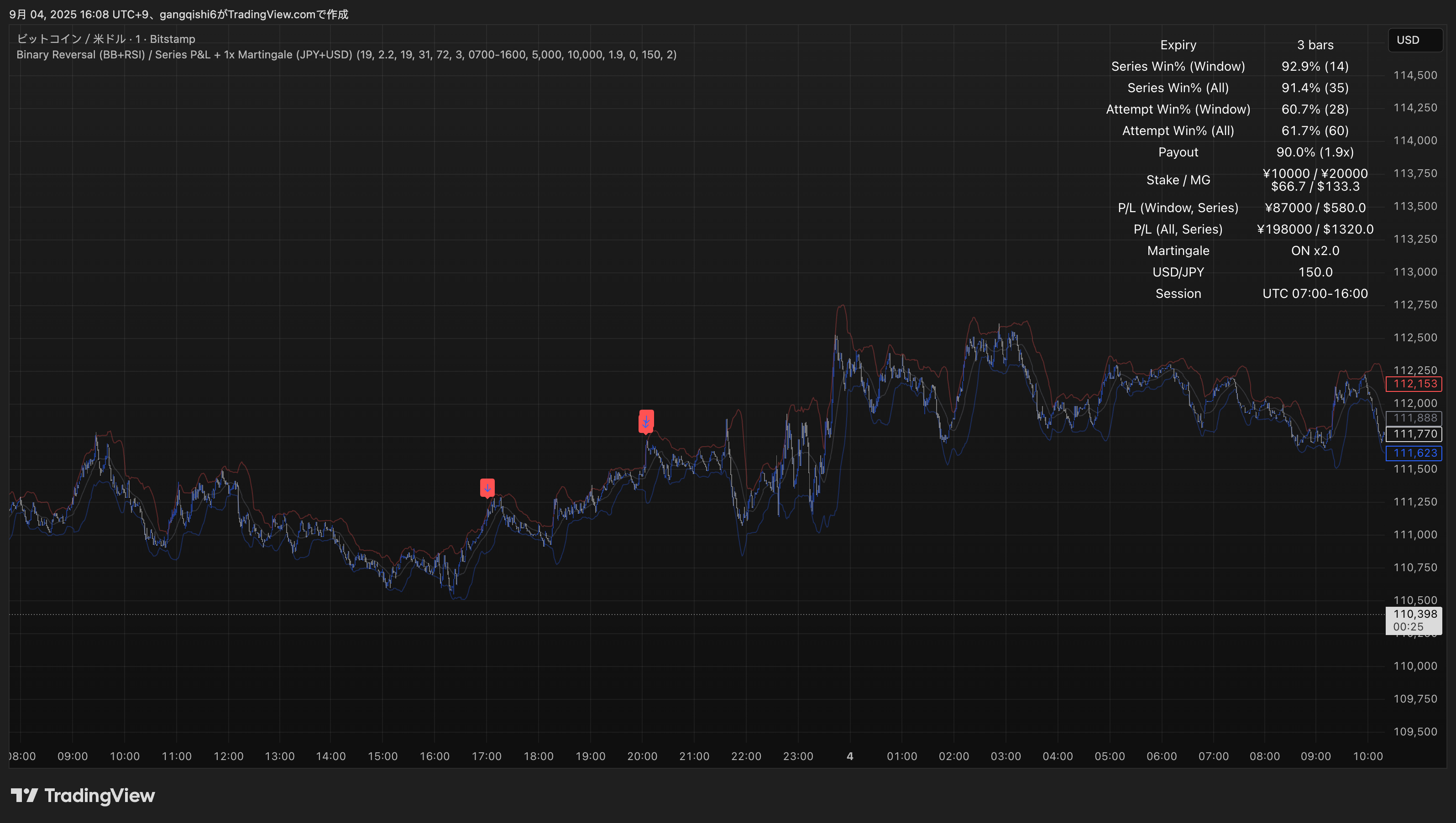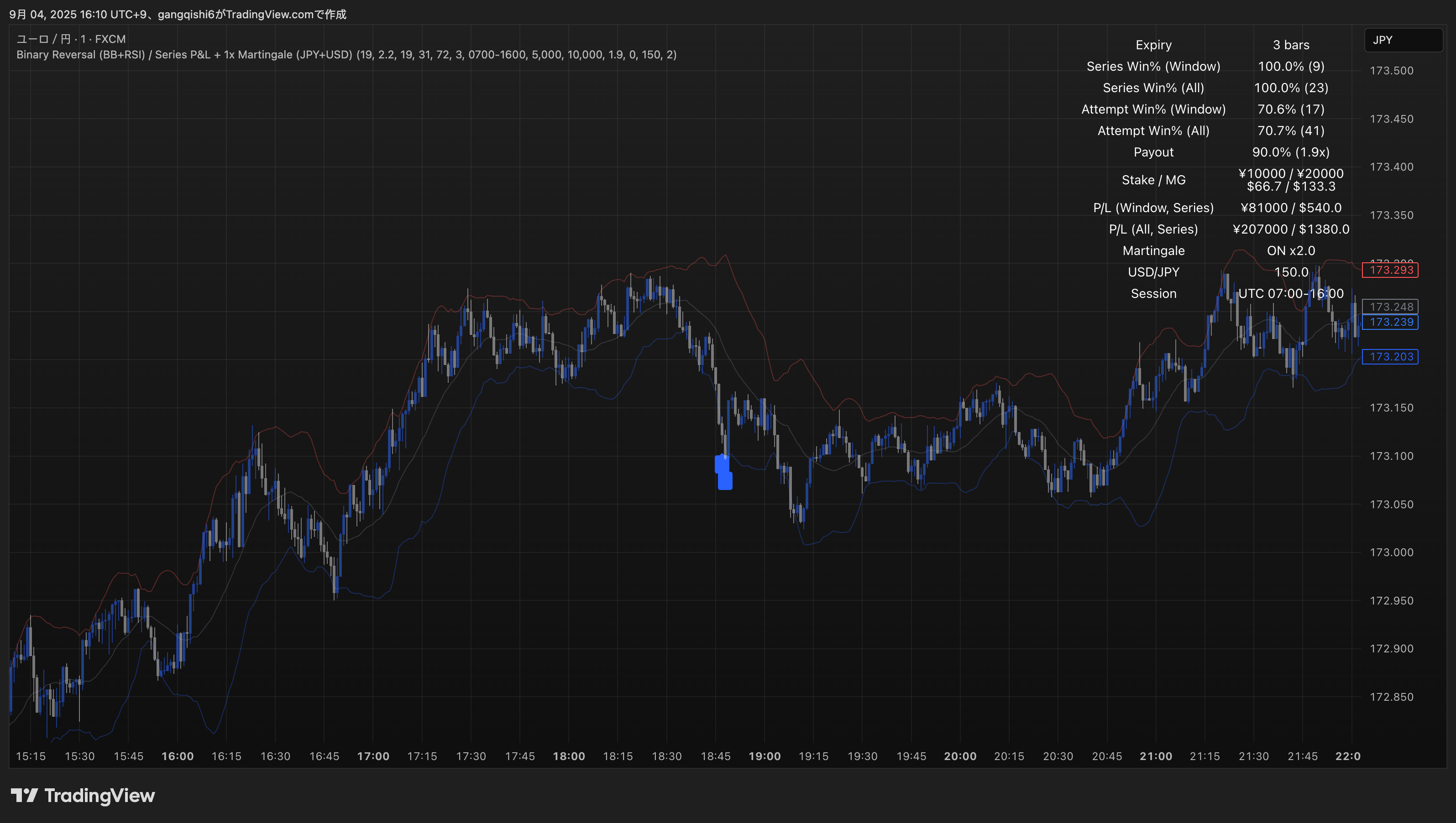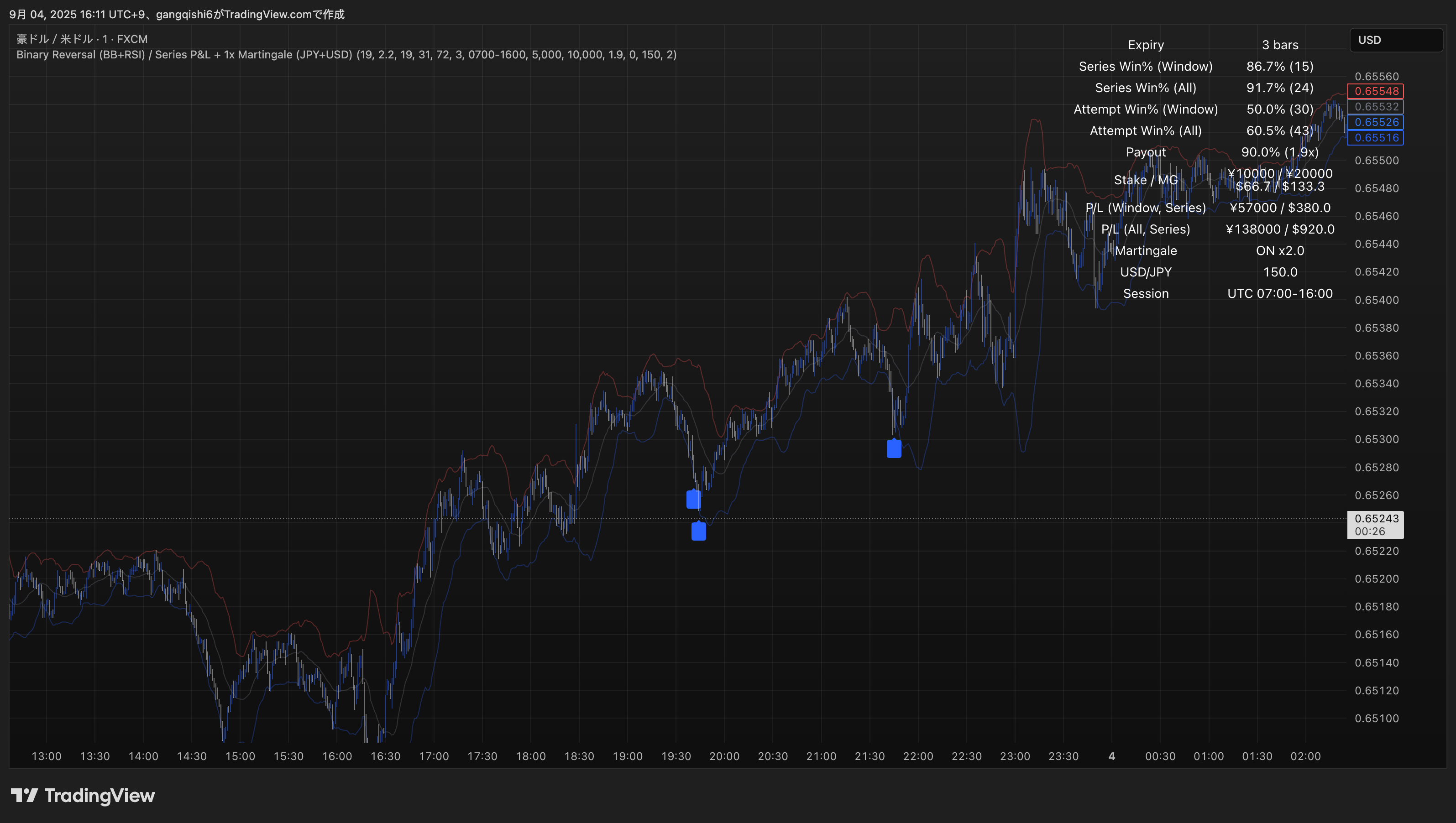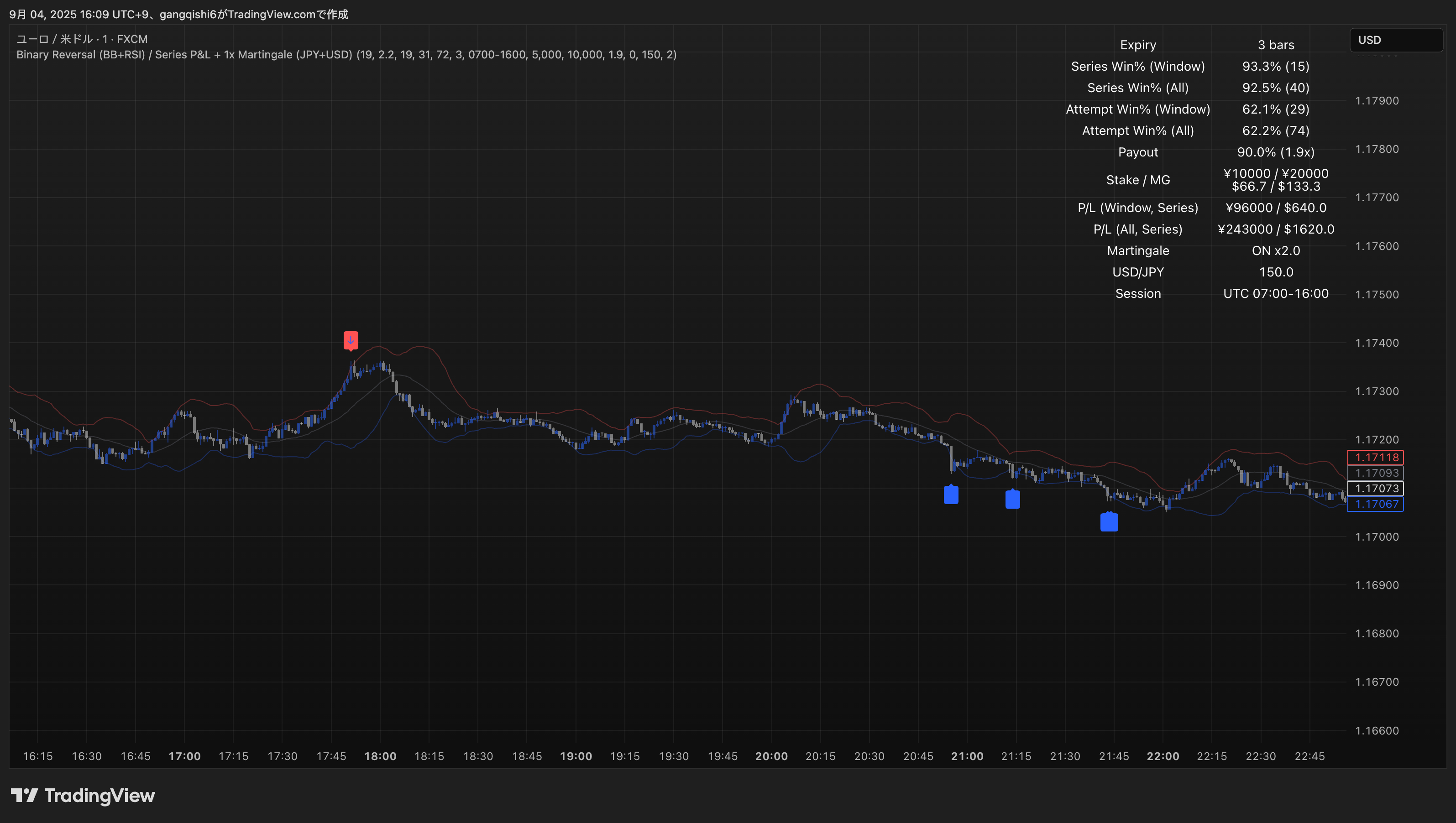 マーチンのON/OFFと倍率を表示。ONなら「資金効率」、OFFなら「シグナル純度」、両方を検証できるのが強みです。USD/JPY(為替レート)
