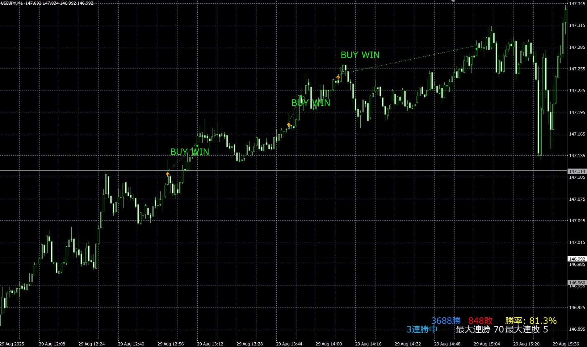 3~5pipsのタイトTPで“抜けの勢い”を素早く取る方針。連勝パターンを捉えやすく、日中の小刻みな収益積み上げに相性◎