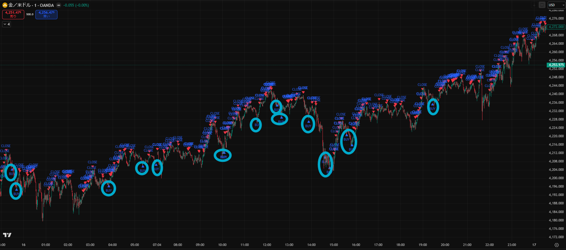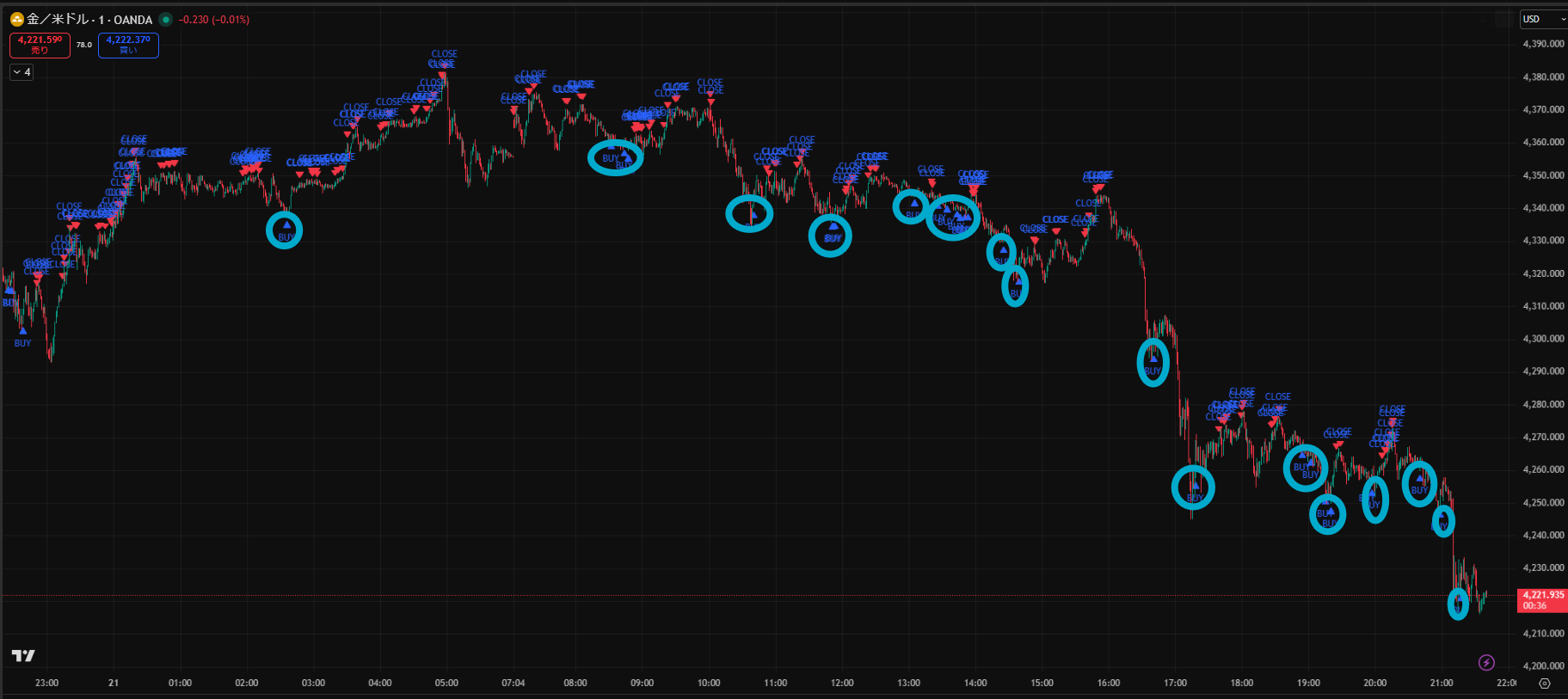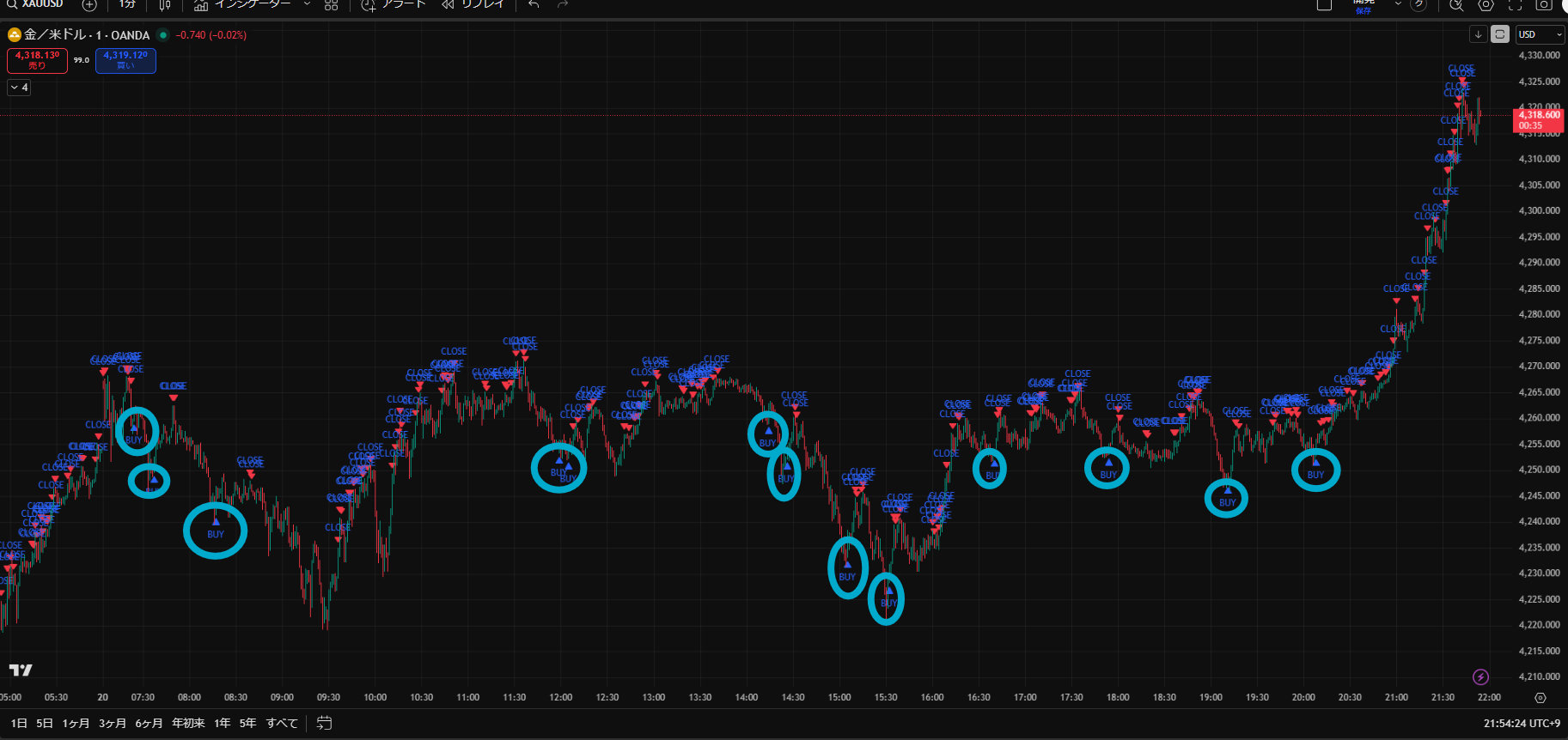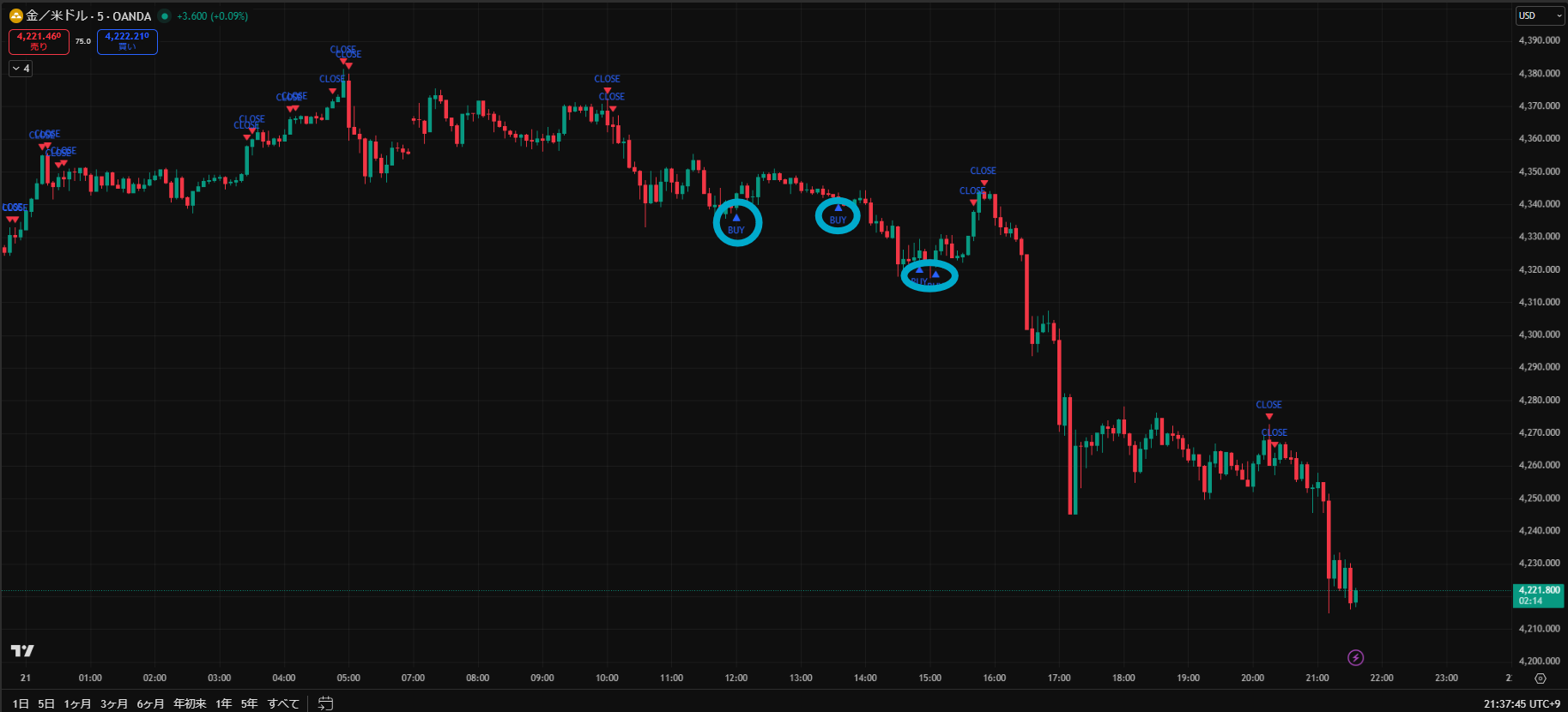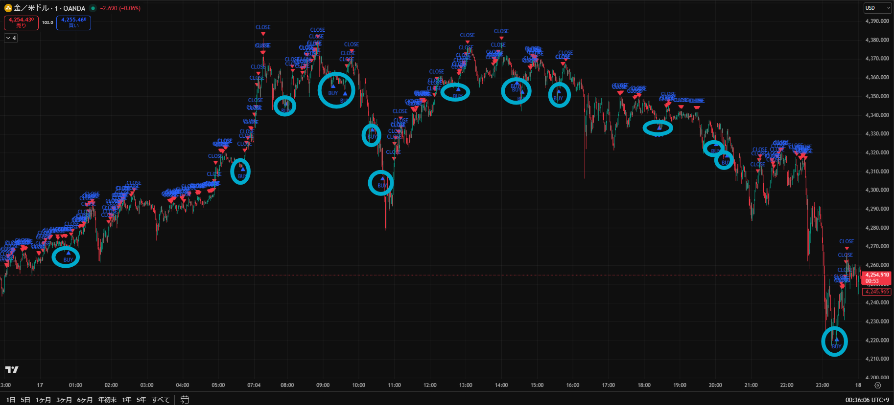 価格がだらだら下がる日でしたが、Closeサインを見ながらトレードすることで細かく利益を積み重ねることができますね。