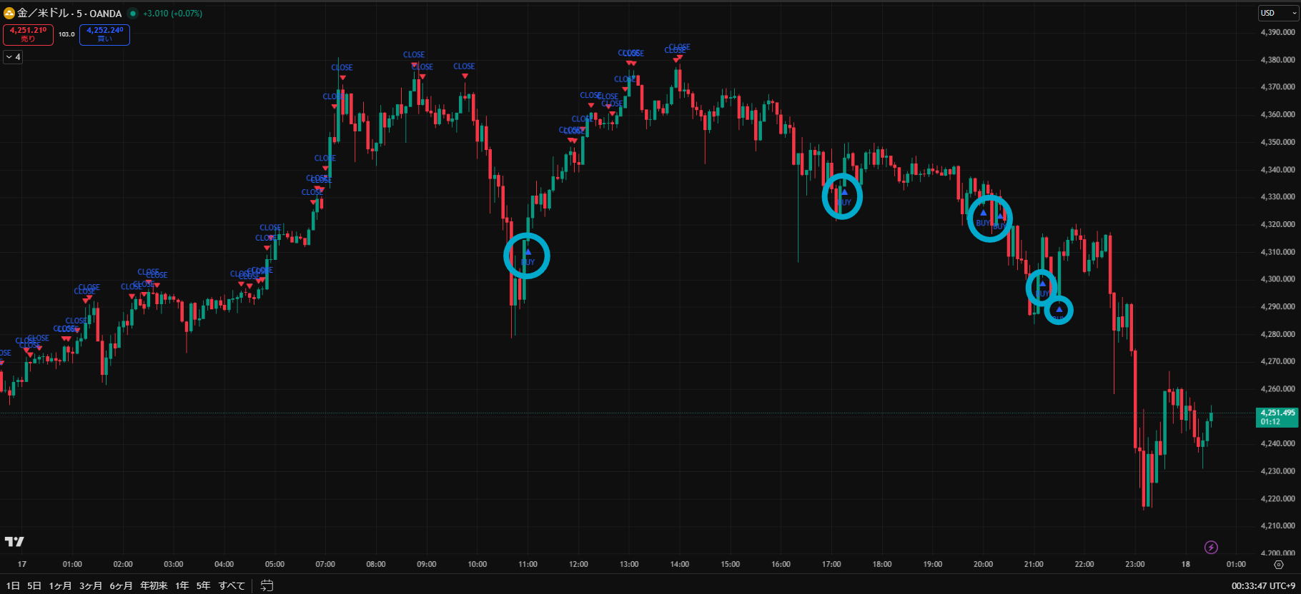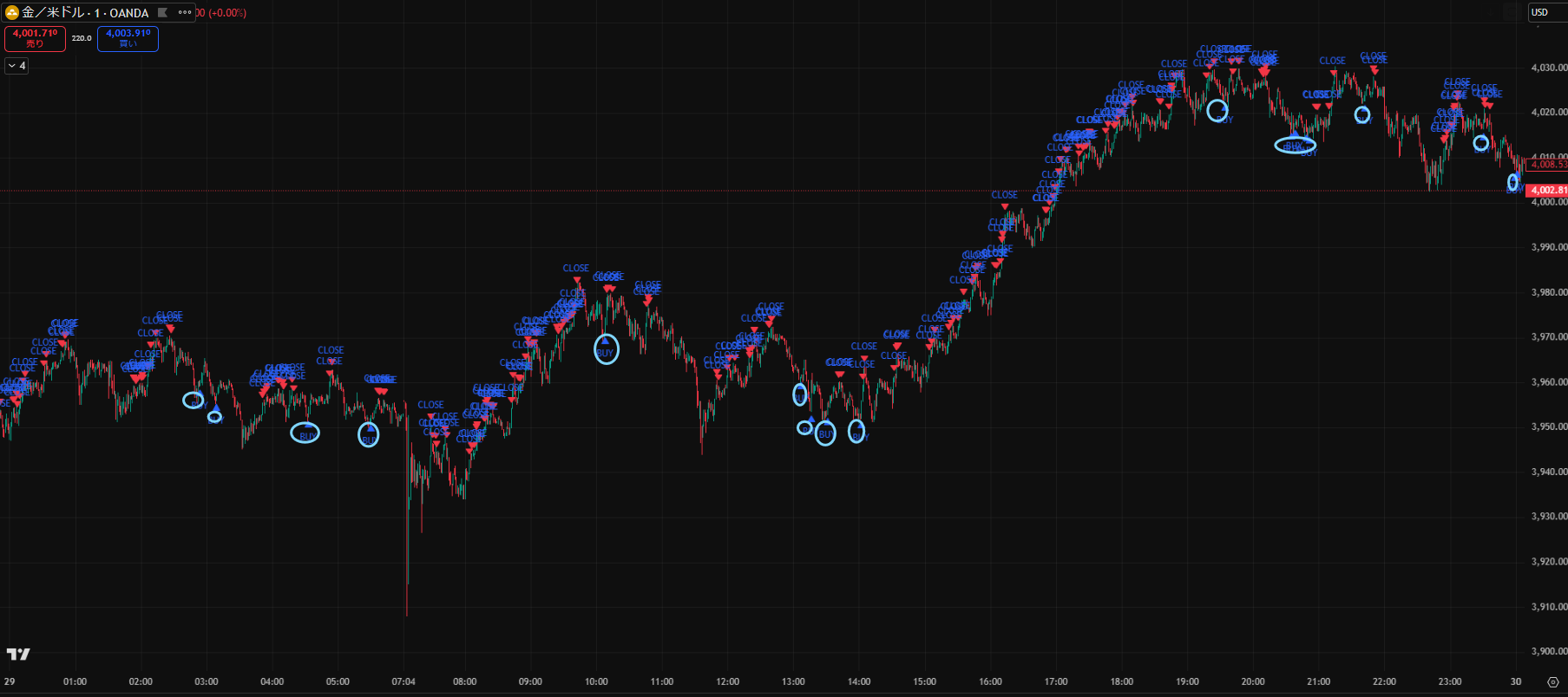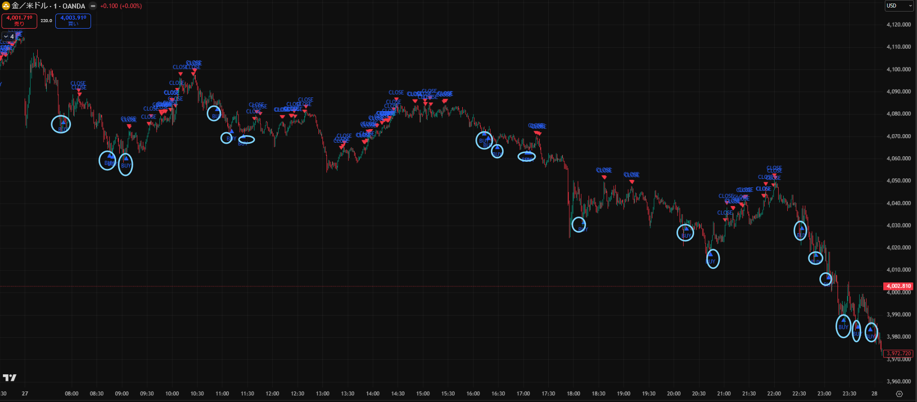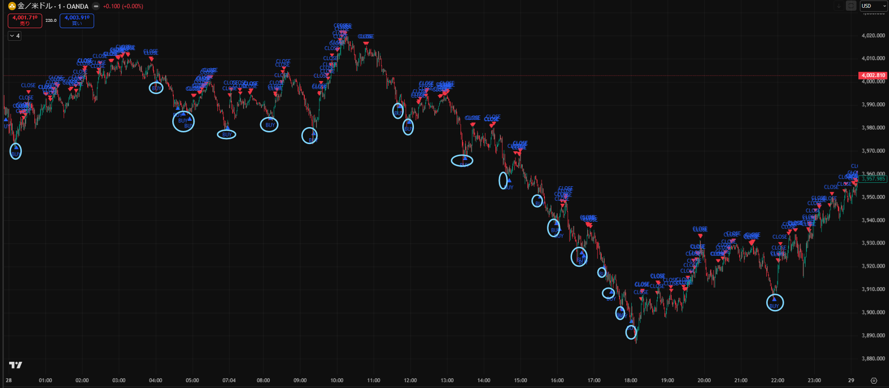 価格がだらだら下がる日でしたが、Closeサインを見ながらトレードすることで細かく利益を積み重ねることができますね。