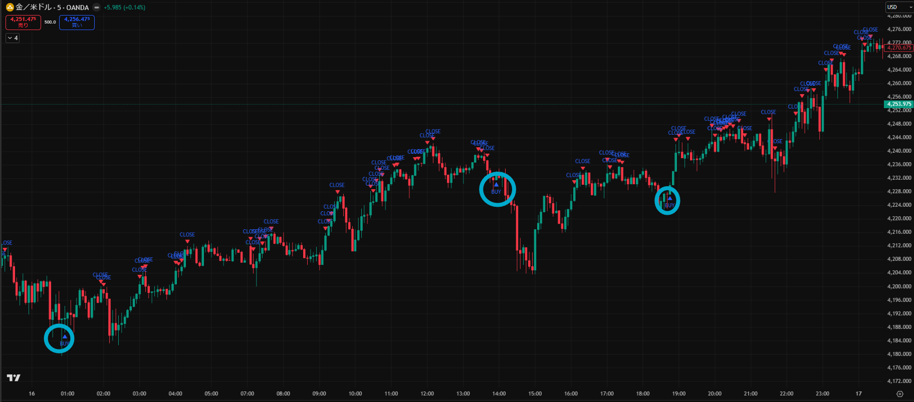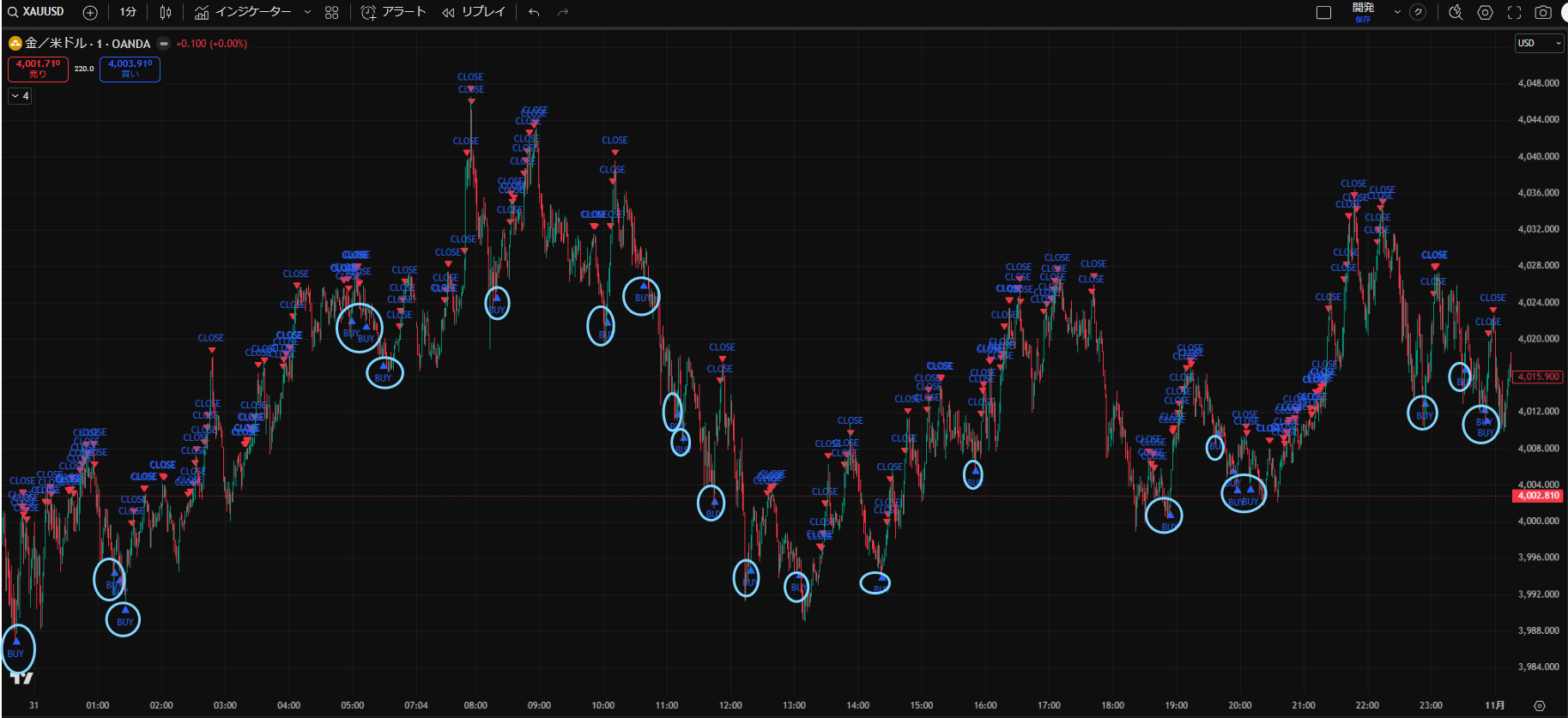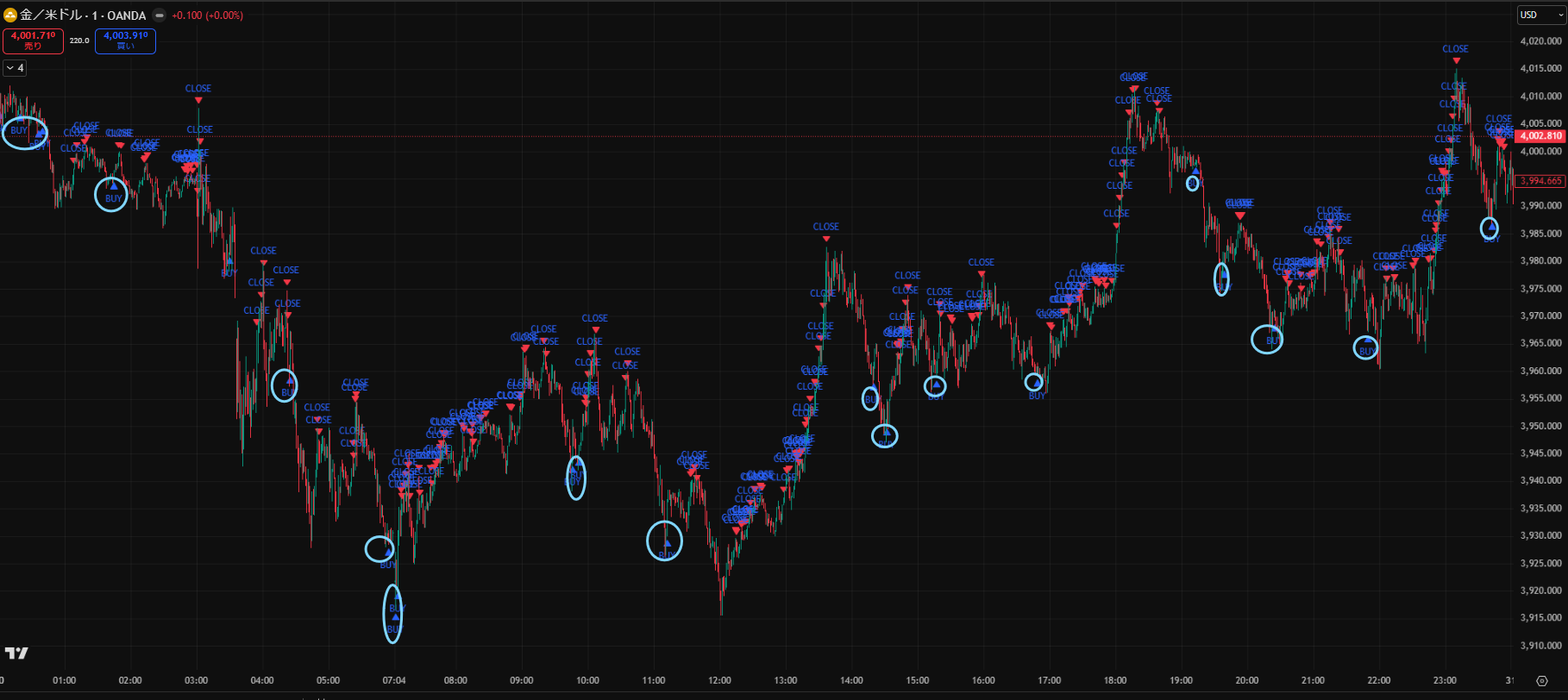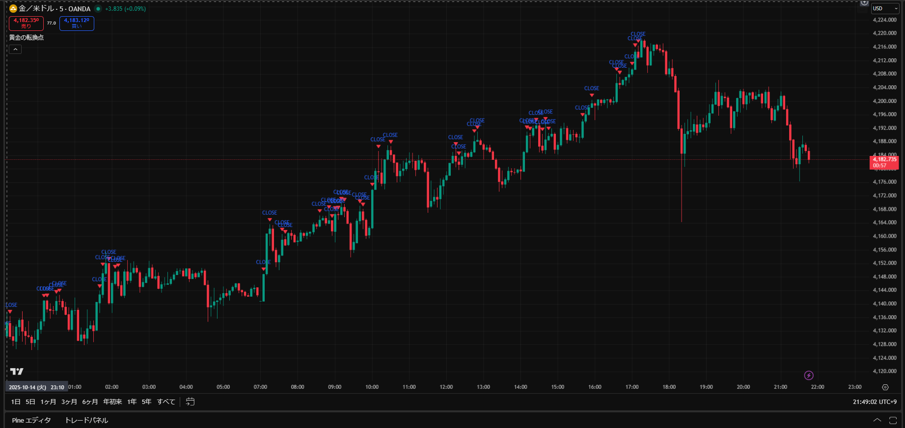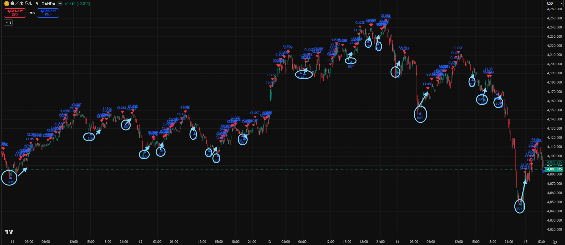 価格がだらだら下がる日でしたが、Closeサインを見ながらトレードすることで細かく利益を積み重ねることができますね。