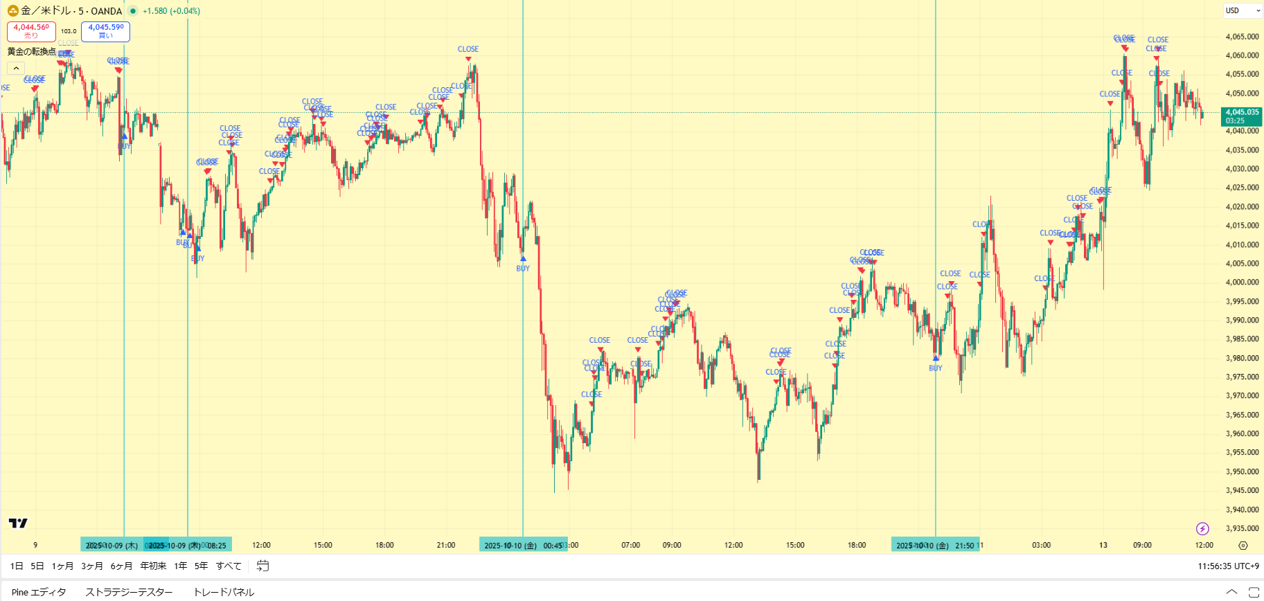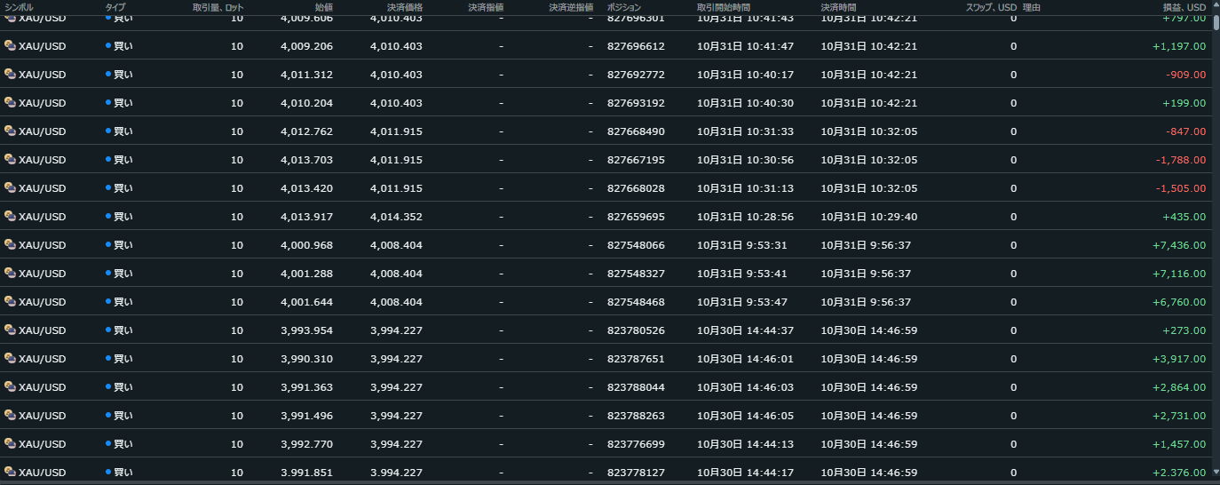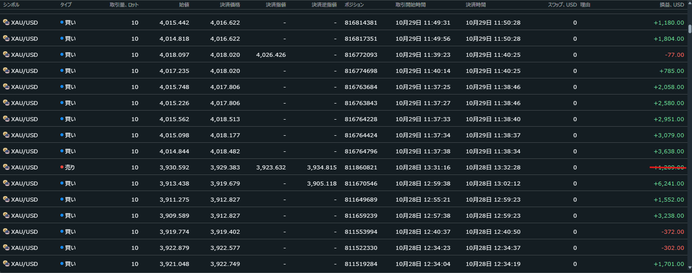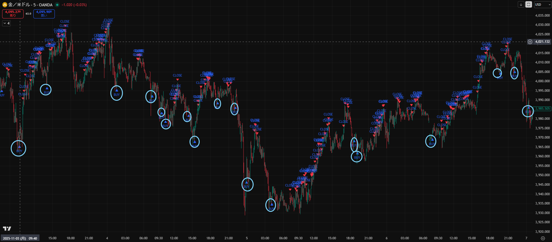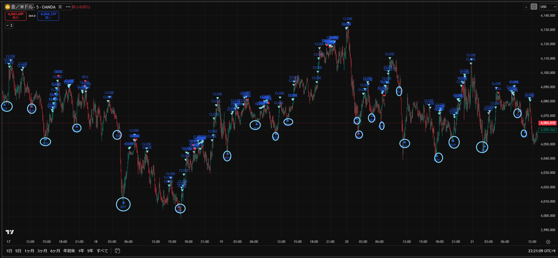 価格がだらだら下がる日でしたが、Closeサインを見ながらトレードすることで細かく利益を積み重ねることができますね。