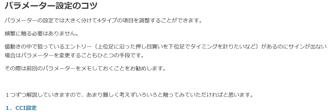 商品マニュアルにて、各パラメーターの説明とパラメーター変更をしたい場合のコツを記載させていただいております(下図は一部です)。