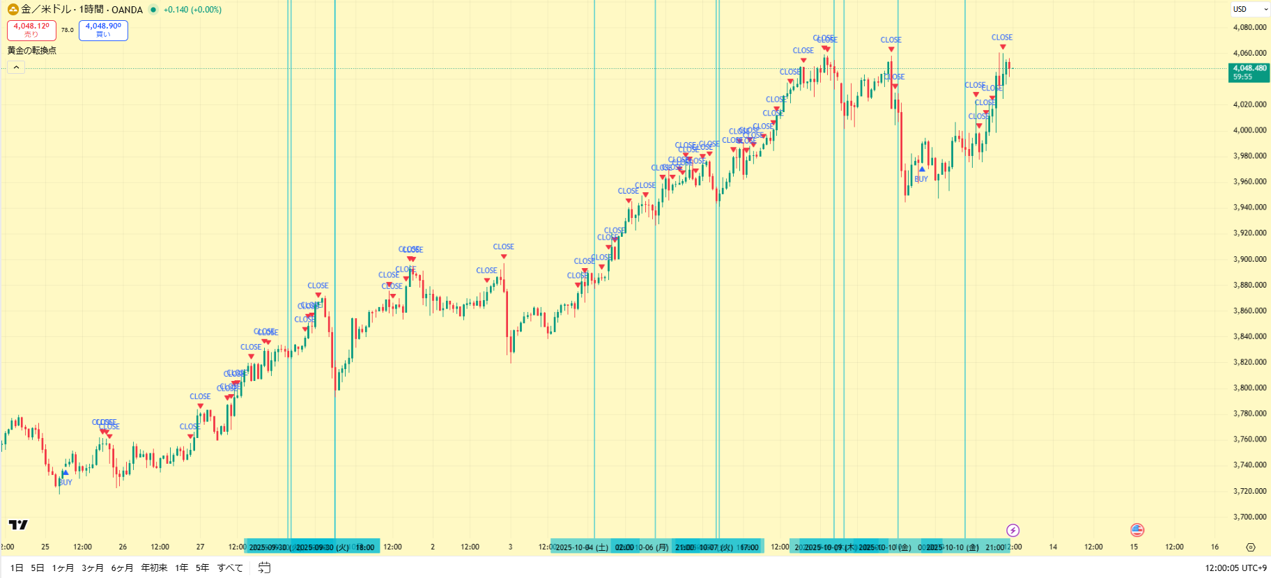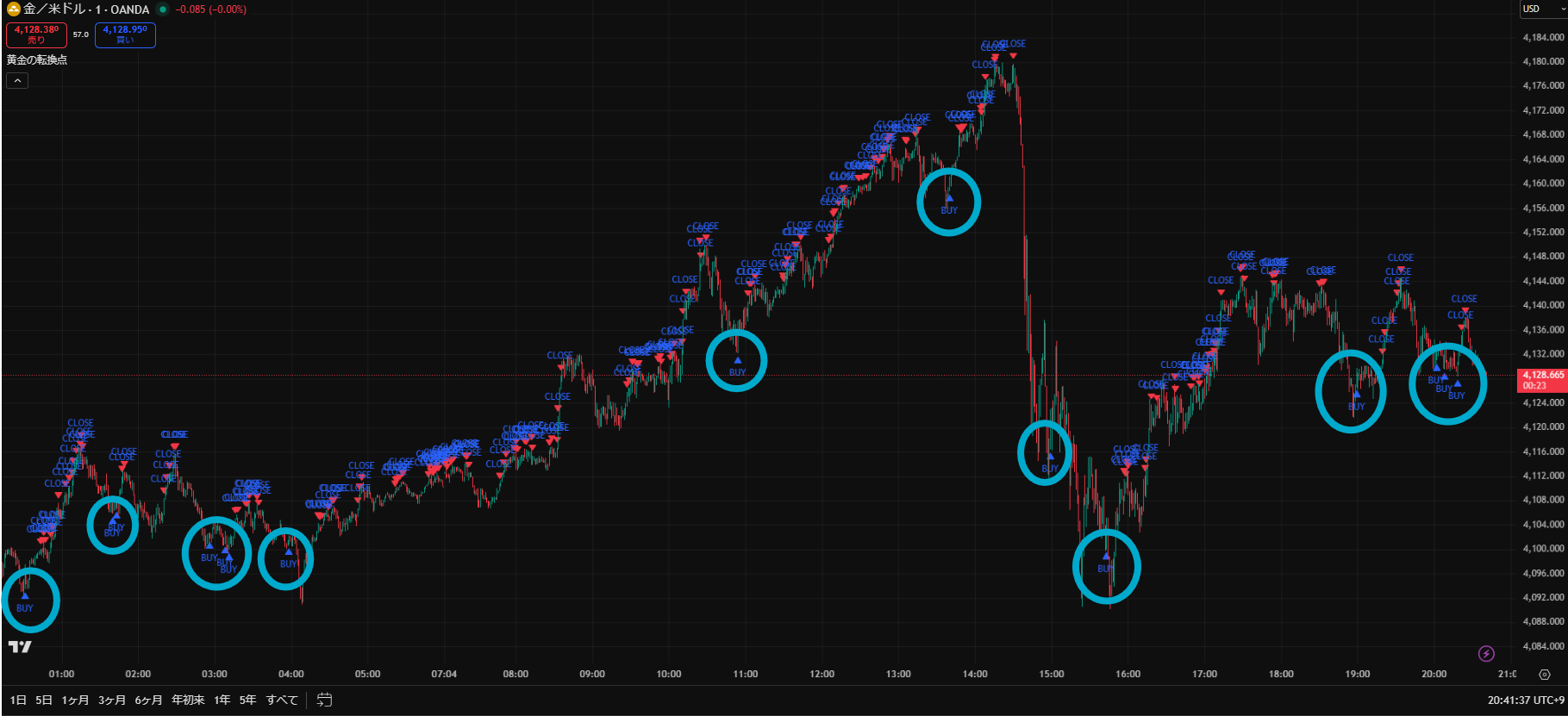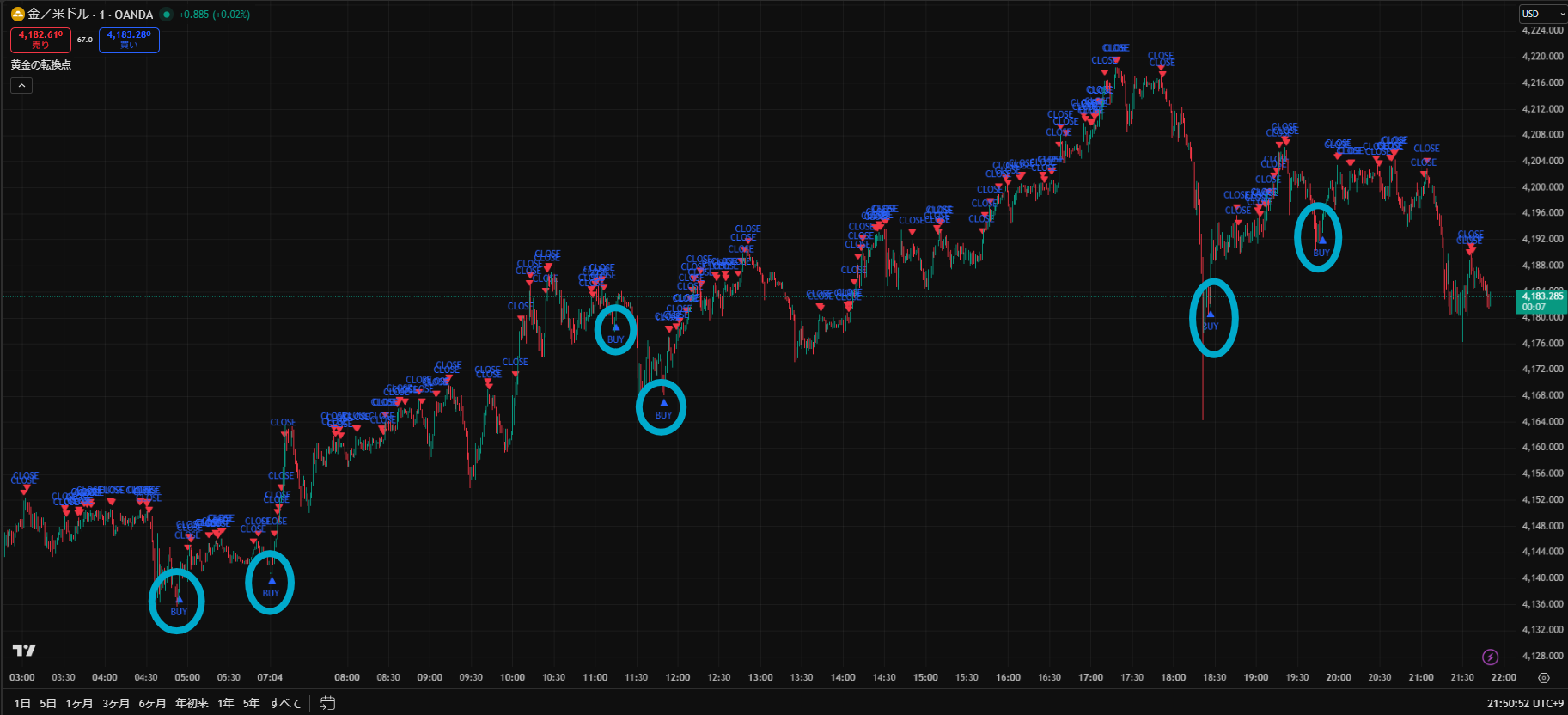 上位足で相場の流れをつかみ、5分足サインでエントリーすることが、”黄金の転換点”の理想です。