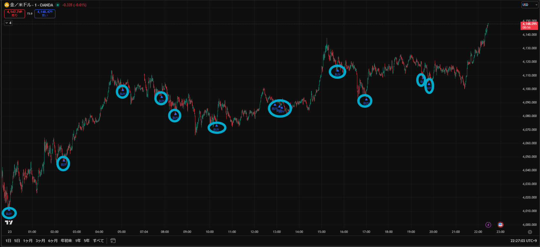 上昇トレンドに対して押し目買いサインが3回点灯しました。