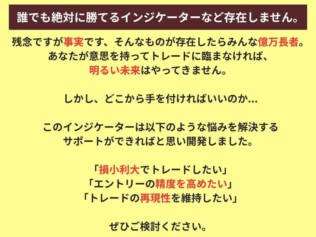 また、説明上バックテスト結果を記載しておりますが、本商品はEAではなくインジケーターですので、当サインを確認した後、ご自身の判断でトレードを実施ください。