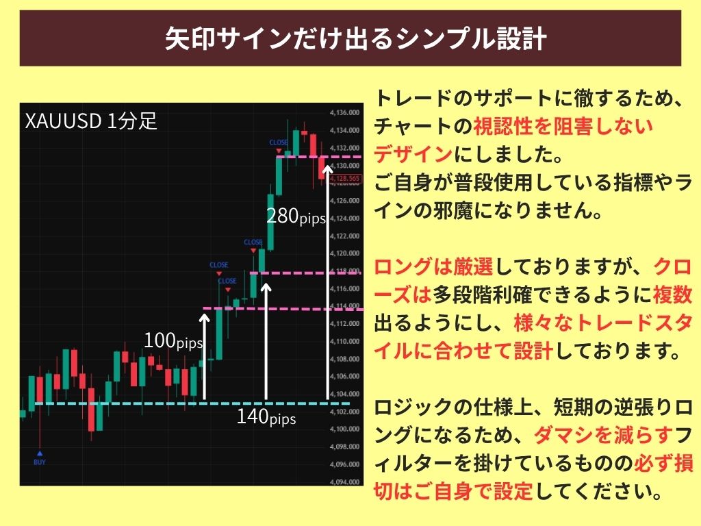 このインジケーターはゴールド(XAUUSD)専用に最適化されたロング特化型インジケーターで、