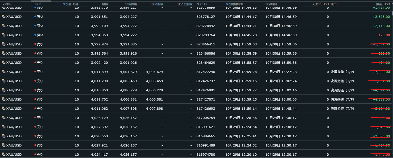 (赤線で消している履歴は、本インジケーターを使用せず間違えてトレードしてしまったショートです)