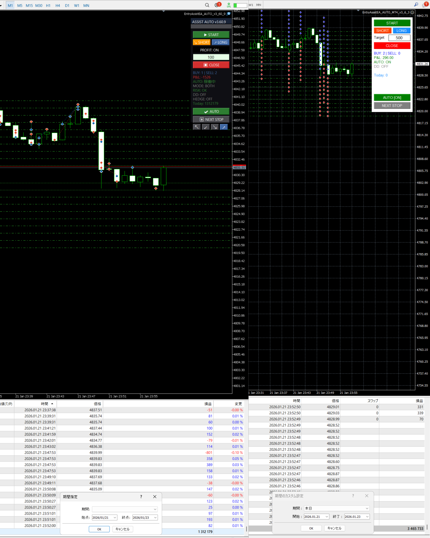 V3.2 リスクコントロール強化版 予告 v3.1からv3.2への主要アップグレード内容: 1. リスク管理機能の大幅強化 【最大ドローダウン管理】 ・設定%に達すると自動で全ポジション決済 【両建て検知機能】 ・両建てポジション数が上限に達すると自動停止 【一日の目標利益管理】 ・日付が変わると自動リセット 2. エントリー方向制御機能 【方向指定ボタン】 ・LONGボタン - BUY注文のみ配置 ・SHORTボタン - SELL注文のみ配置 ・STARTボタン - 両方向(従来通り) 3. NEXT STOPモード 次のセット完了後にAUTOモードを自動停止予約するボタン追加 リスク発動時もAUTO停止 一日の目標達成時もAUTO停止 4. ロット倍率の可変化 v3.1ではロット倍率2倍で固定、v3.2では任意指定可能 ゼロ設定で倍率無しのピラミッティング 6. 安全機能の強化 【リスク再開制御】 リスク停止後の自動再開時刻管理 AUTOモードOFF時は再開キャンセル NEXT STOP有効時は再開しない 【利益目標のリアルタイム更新】 AUTO中でも利益目標を動的に変更可能 入力欄の値を即座に反映 7. パフォーマンス最適化 バックテスト環境の自動検出 8.設定の保存/読み込み機能 これらの変更により、v3.2はより安全で柔軟な取引管理が可能になり、 特にリスク管理面で大幅に機能が強化されています。 更にv3.2ではアラート表示にセット利益とセット損失が表示できるようにしました。 添付画像参照 両建て検知決済して損失が出るとそのように表示もされます。 (目標金額設定 500円) 今回は既存の機能もバージョンアップしています。 例えばパネルの利益を入力する欄ですが、現在は稼動中に数字を書き直しても変更できません。 一旦、PROIFTボタンをOFFにしてONにしなければ途中変更はできません。 次期バージョンではただ入力すれば変更されるように仕様変更しました。 その他、稼動中に再起動してしまっても設定を維持できるように記憶させるようにしました。 今度のバージョンは見た目だけでなく中身の改善も行いましたので 単なるポジションを取るだけのものではない高機能化ツールになっています。 出来るだけシンプルに分かりやすくという前提で作っています
