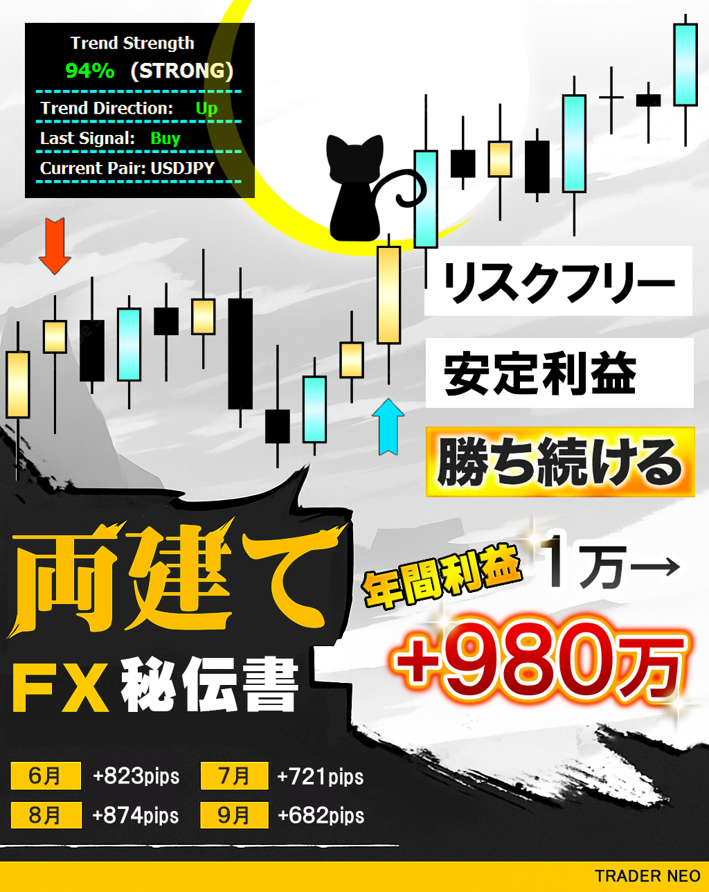 A. 1日数時間程度あれば+50~80pips程度は可能な戦略です。 通常のトレードと両建てを組み合わせているため、積極的に利益を伸ばしながら、含み損になりそうな場合はリスク回避で両建てを組み合わせて、損失をフラット化しつつ、利益に変えます。 Q. 両建ての商品はもう一つ出品していますがどちらが良いですか?