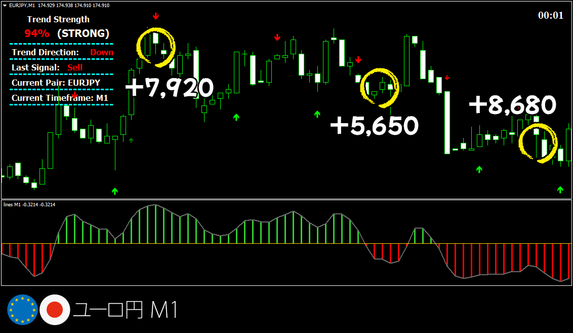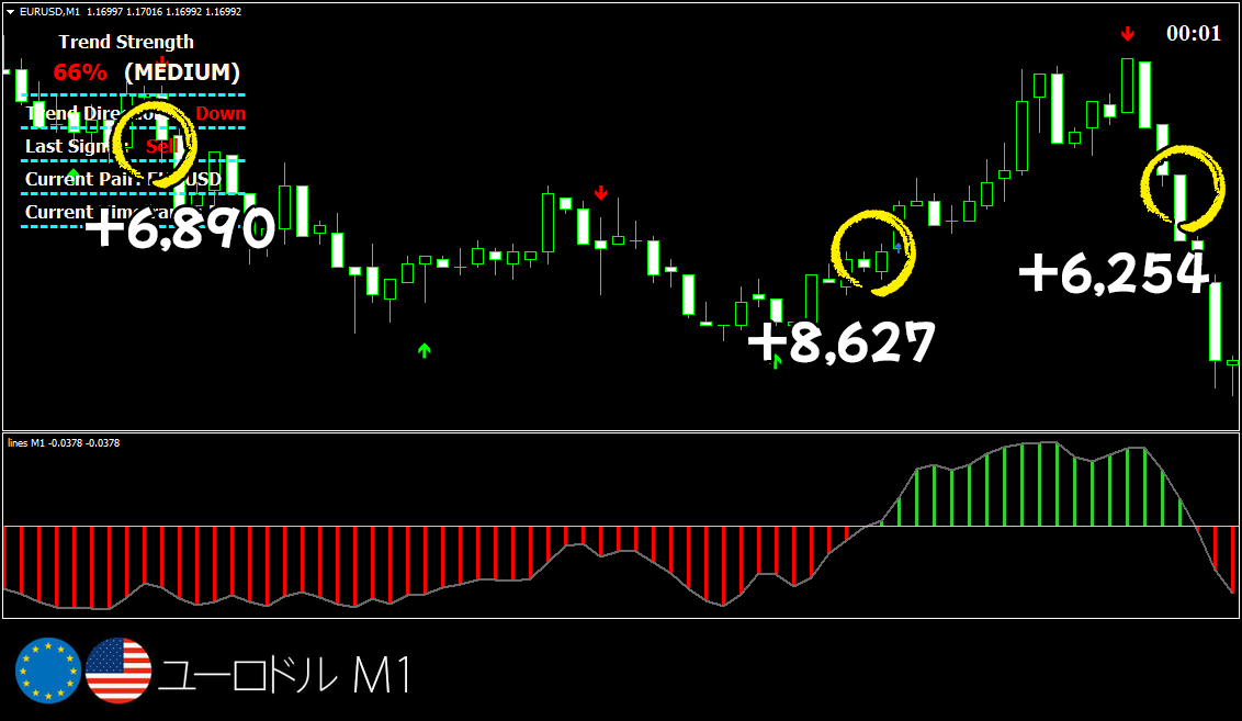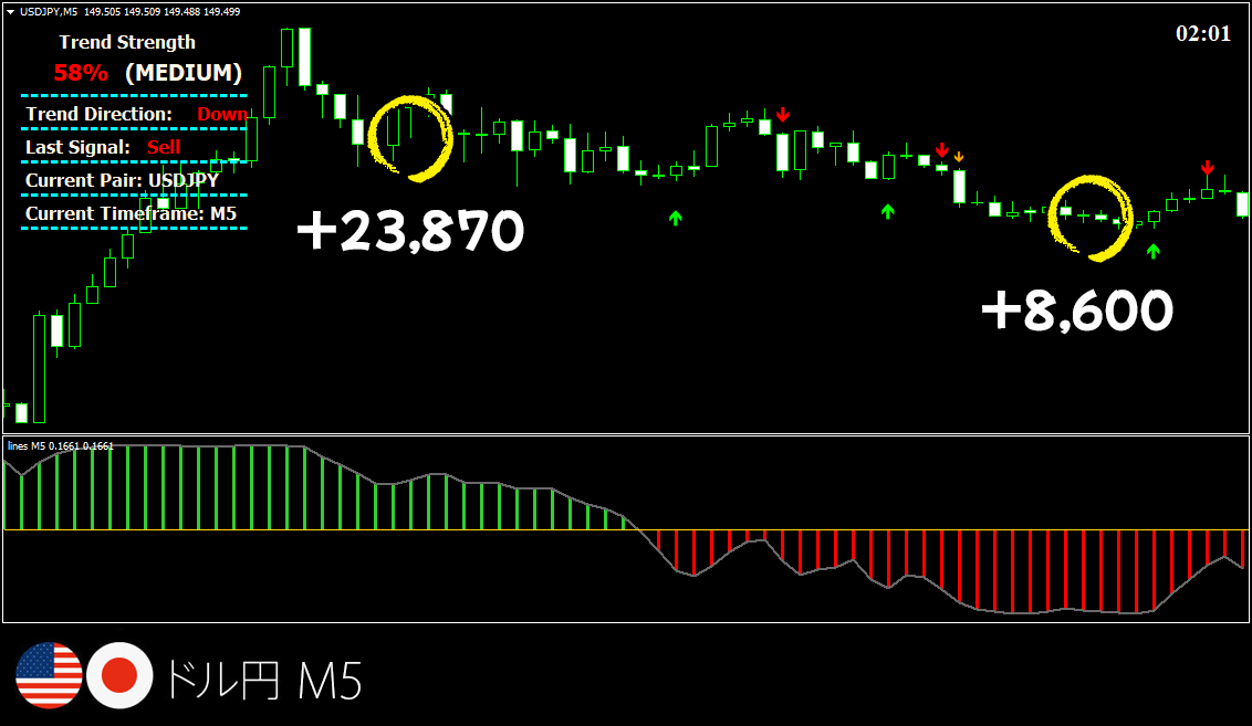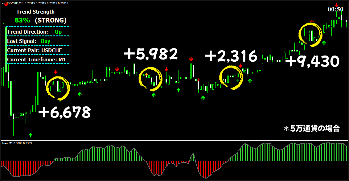 結果的にこれを続けることで1日を通しても安定して勝てます。 もう、迷うことも負け越す心配もありません! あまりの相性の良さに、あなたは驚くことでしょう。 上記のチャートはレンジ相場気味に為替が推移しています。 両建てポジションを形成するため、値動きの小さな相場でも効率良くトレードができます。 もちろん、レンジ相場は1回当たりの利益は少なくなりますが、負けるリスクをなくしてトレードが楽に行えるので、ぜひ運用ください。 上記のチャートは5分足です。 上位足程、1回の獲得pipsは多くなります。 エントリー回数は1分足に比べると減りますが、それでも1日数時間程度あれば+50~80pips程度は可能な戦略です。 これには先ほど述べましたが最初のエントリーはプラス収益になれば、ルールの通りに決済します。 あくまでもマイナスのポジションに傾けば両建てて、リスクを無くします。 再度、エントリーを開始してプラスのポジションになれば、全決済します。 結果的に、負けもなく、安定した収益化が可能になるのです。 【両建て方法】 トレード手法は、シンプルで簡単です。 1.各種条件が整い矢印サイン「↑」や「↓」が出た後、サインの示す方向にエントリーします。 2.ポジションの利益幅が伸びて決済します。しっかりと守る必要があるのは、この決済ルールです。 3.両建て手法ですが、最初のエントリーは利益が伸びれば決済するだけですのでシンプルです。トレードルール上、プラスポジションが続く限りは通常通りトレードを続けます。 4.一方でエントリー後にマイナスポジションになることもあります。 この場合はあるポイントでポジションを両建てます。 この時点で、マイナス損益は相殺されてリスクは限定されます。 但し、両建てただけではマイナスになることはなくても、プラスになることはありません。ここからが重要なポイントになります。 5.両建てポジションを保有したまま、あるルールに基づいて新たなエントリーを開始します。ここからが、両建て手法の見せ場です。 6.トレードルール上、プラス収益に切り替わる場面が来ますので、その時点で多少の利益でも利確します。これで、両建てポジションは全決済されます。 7.その後は新たにトレードを開始して、利益を積み上げていきましょう。 8.1日に+50~80pips程度になれば無理をせずにトレードを終了して、日々コツコツとトレードを続けていきましょう。 ※エントリーと両建てルールは明確です。迷わず決済すれば、損失が発生するリスクはとても低くなります。 ※極めて明確なシステムであり、トレードマニュアルPDFでも詳しく解説しており安心です。サインの出方と両建てポイントに慣れていただければ、とても有効に機能するシステムです。 【ロジックについて】 「両建てFX秘伝書」では何よりもトレードルールが中核になりますが、エントリーや決済の材料として、矢印サインツールやトレンドの分析ツールも使用します。その特徴を解説します。 ■矢印サインツール 矢印サインツールには2つのロジックを導入して作成しています。これにより高精度なエントリーが可能となります。 一般的な矢印サインツールは発生回数を増やせばエントリー精度は下がります。逆に減らせがエントリー精度は上がります。 この手法の肝となるのはリスク回避で両建てることが可能な点です。