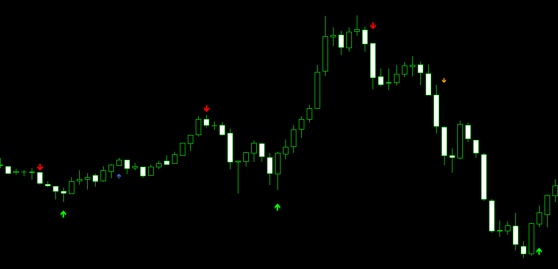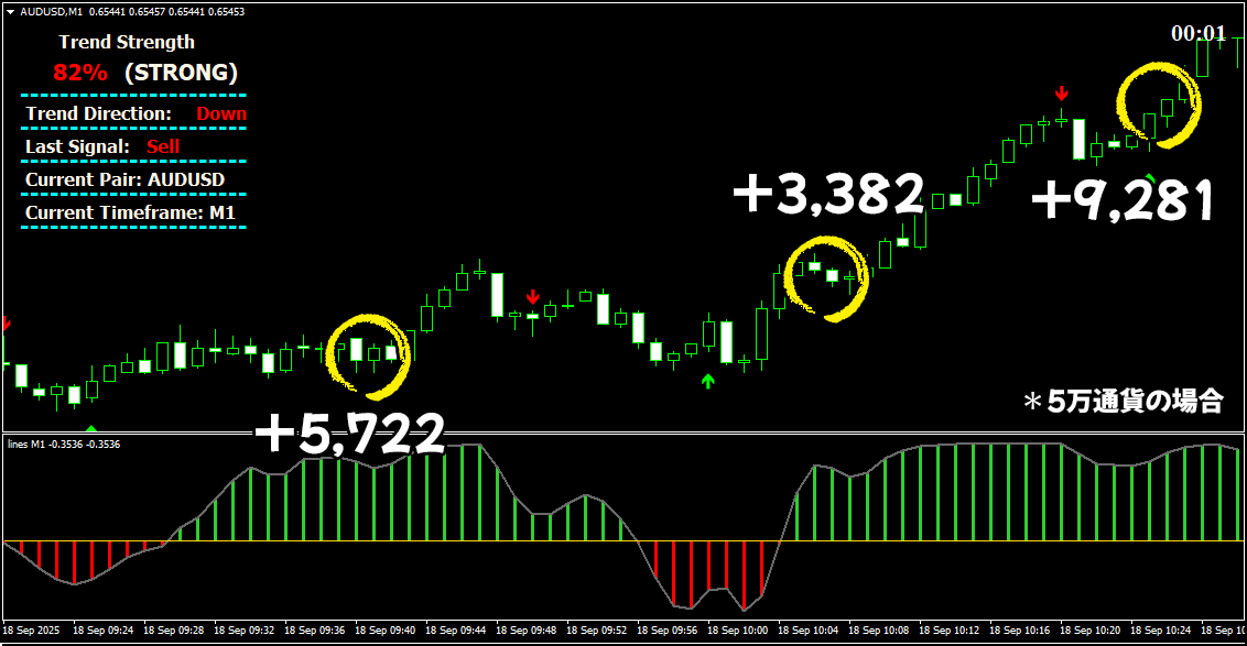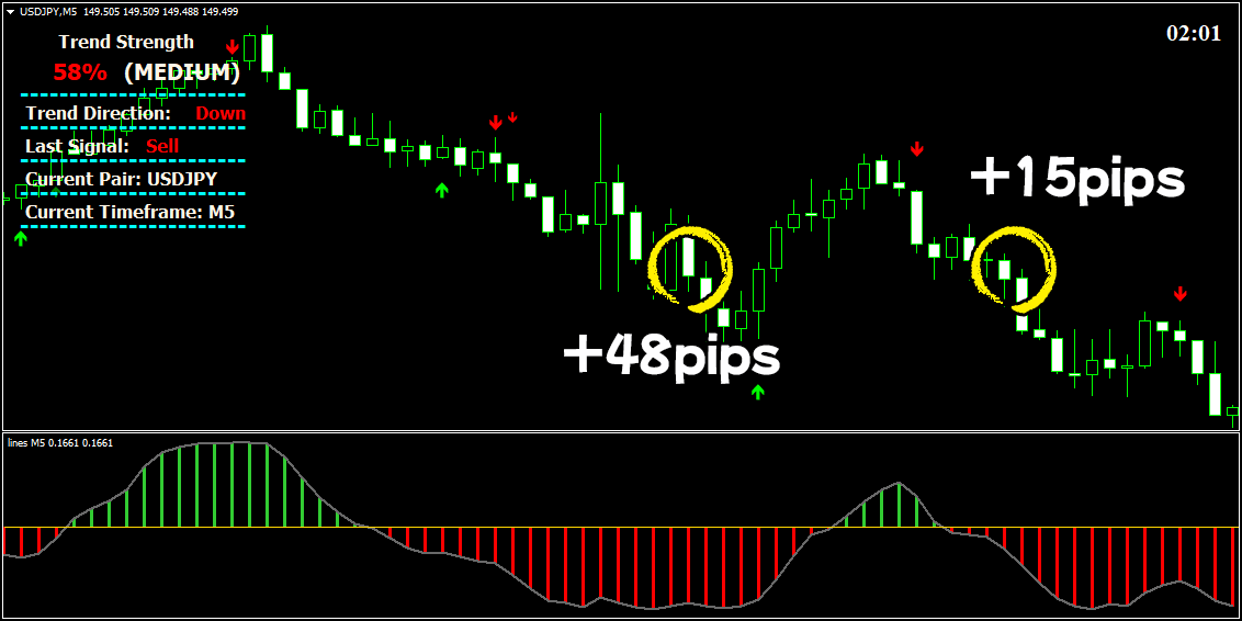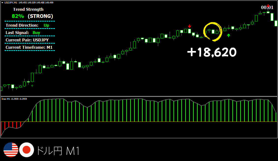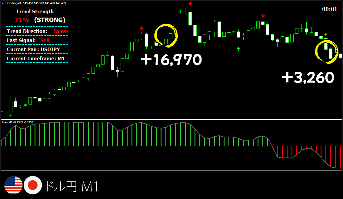 結果的にこれを続けることで1日を通しても安定して勝てます。 もう、迷うことも負け越す心配もありません! あまりの相性の良さに、あなたは驚くことでしょう。 上記のチャートはレンジ相場気味に為替が推移しています。 両建てポジションを形成するため、値動きの小さな相場でも効率良くトレードができます。 もちろん、レンジ相場は1回当たりの利益は少なくなりますが、負けるリスクをなくしてトレードが楽に行えるので、ぜひ運用ください。 上記のチャートは5分足です。 上位足程、1回の獲得pipsは多くなります。 エントリー回数は1分足に比べると減りますが、それでも1日数時間程度あれば+50~80pips程度は可能な戦略です。 これには先ほど述べましたが最初のエントリーはプラス収益になれば、ルールの通りに決済します。 あくまでもマイナスのポジションに傾けば両建てて、リスクを無くします。 再度、エントリーを開始してプラスのポジションになれば、全決済します。 結果的に、負けもなく、安定した収益化が可能になるのです。 【両建て方法】 トレード手法は、シンプルで簡単です。 1.各種条件が整い矢印サイン「↑」や「↓」が出た後、サインの示す方向にエントリーします。 2.ポジションの利益幅が伸びて決済します。しっかりと守る必要があるのは、この決済ルールです。 3.両建て手法ですが、最初のエントリーは利益が伸びれば決済するだけですのでシンプルです。トレードルール上、プラスポジションが続く限りは通常通りトレードを続けます。 4.一方でエントリー後にマイナスポジションになることもあります。 この場合はあるポイントでポジションを両建てます。 この時点で、マイナス損益は相殺されてリスクは限定されます。 但し、両建てただけではマイナスになることはなくても、プラスになることはありません。ここからが重要なポイントになります。 5.両建てポジションを保有したまま、あるルールに基づいて新たなエントリーを開始します。ここからが、両建て手法の見せ場です。 6.トレードルール上、プラス収益に切り替わる場面が来ますので、その時点で多少の利益でも利確します。これで、両建てポジションは全決済されます。 7.その後は新たにトレードを開始して、利益を積み上げていきましょう。 8.1日に+50~80pips程度になれば無理をせずにトレードを終了して、日々コツコツとトレードを続けていきましょう。 ※エントリーと両建てルールは明確です。迷わず決済すれば、損失が発生するリスクはとても低くなります。 ※極めて明確なシステムであり、トレードマニュアルPDFでも詳しく解説しており安心です。サインの出方と両建てポイントに慣れていただければ、とても有効に機能するシステムです。 【ロジックについて】 「両建てFX秘伝書」では何よりもトレードルールが中核になりますが、エントリーや決済の材料として、矢印サインツールやトレンドの分析ツールも使用します。その特徴を解説します。 ■矢印サインツール 矢印サインツールには2つのロジックを導入して作成しています。これにより高精度なエントリーが可能となります。 一般的な矢印サインツールは発生回数を増やせばエントリー精度は下がります。逆に減らせがエントリー精度は上がります。 この手法の肝となるのはリスク回避で両建てることが可能な点です。