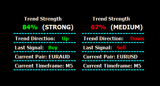 だからこそ、複数のロジックを併用して、積極的なエントリーができるように、エントリー回数は多すぎず少なすぎず、適度なバランスで設計しています。 まさに、両建てにピッタリな矢印サインツールに仕上げています。 ■各種分析ツール 矢印サインツール単独ではどうして大きなトレンドを読み解くことは苦手です。そのため、補助となる各種分析ツールを組み合わせます。 トレンドの強さが%で表示されて、現在の相場がUpかDownで表示されます。 利益幅を伸ばす際の参考にもなります。 緑色線で上昇トレンド、赤色線で下降トレンドを示します。 もちろん、相場にはレンジも存在します。 但し、レンジ相場と言え、大きな流れでいえば上昇基調か下降基調かに分かれます。