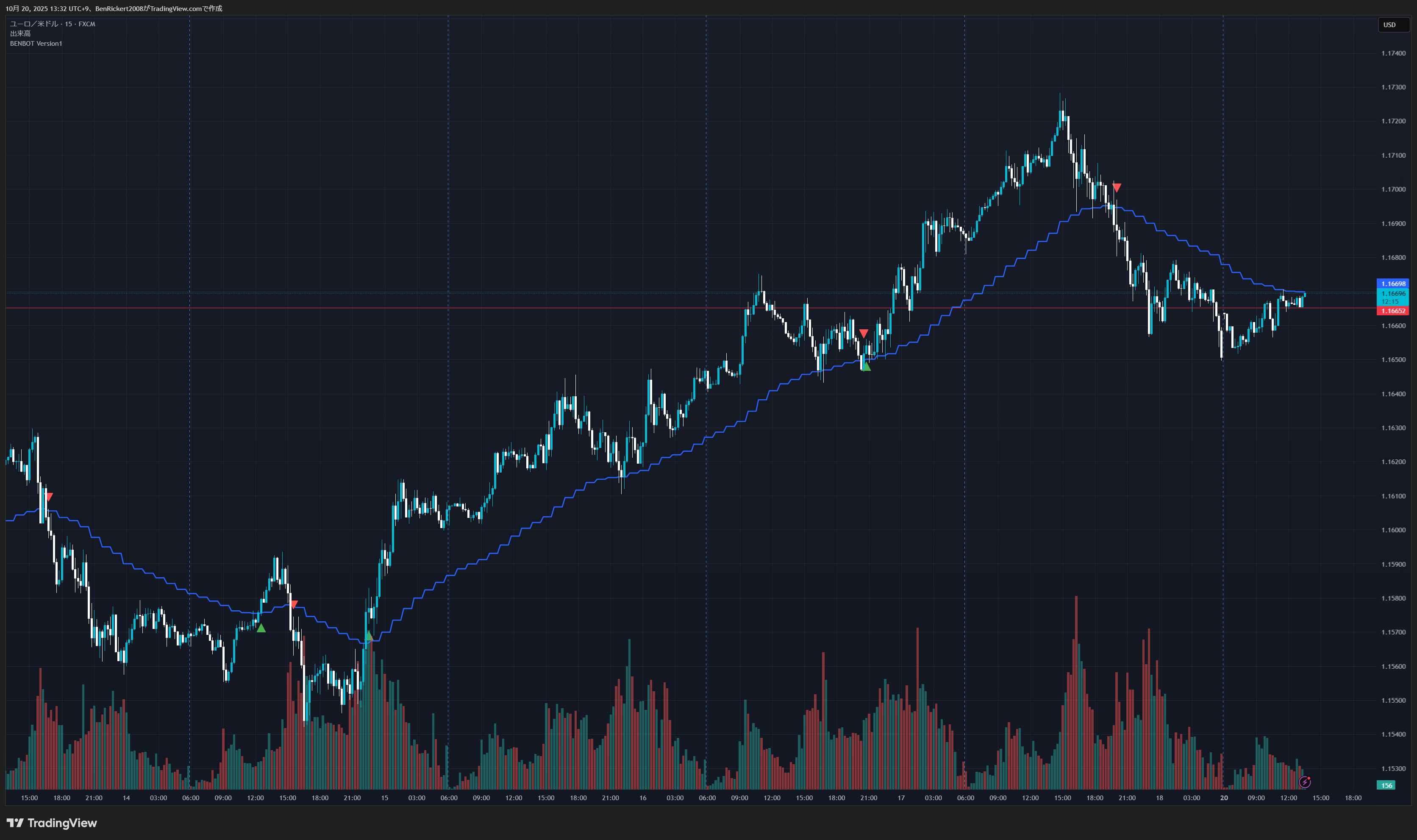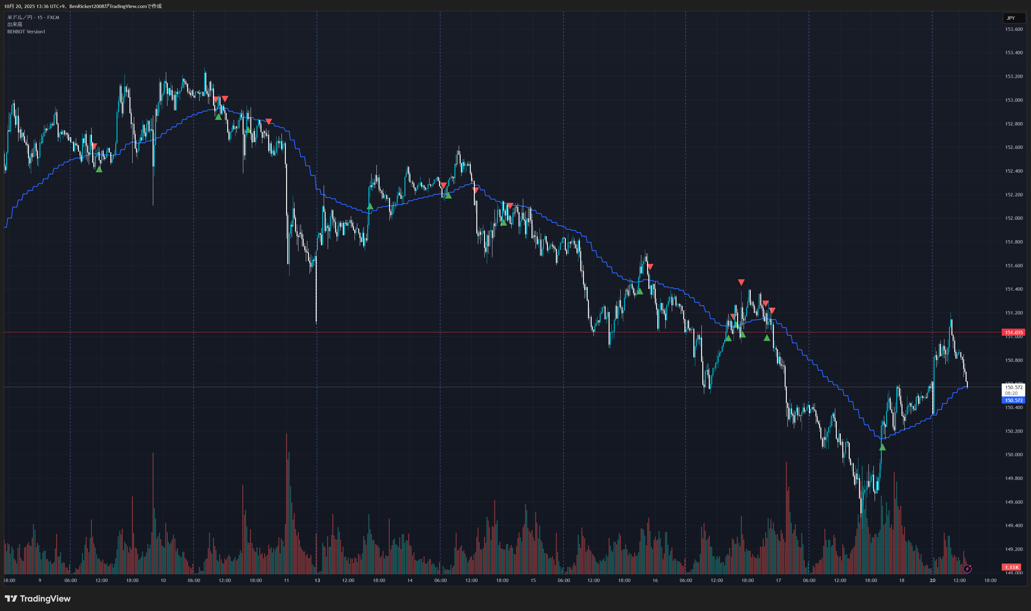 BENBOTは、TradingView向けに開発された裁量取引補助ツールです。1時間足ベースのトレンドフォロー戦略をサポートし、15分足確定時にエントリーシグナルを提供します。エグジットはトレーダー自身の分析に委ねるシンプルな設計で、中長期の相場環境認識を活かしたいトレーダーに最適です。