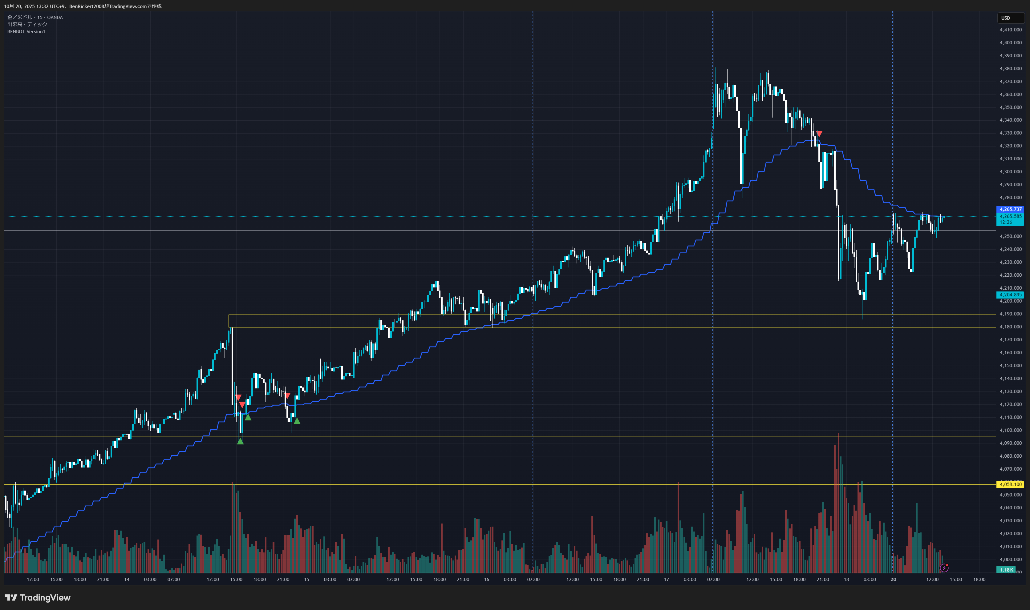 GOLDは強い上昇トレンドから高値圏での広いレンジにいます。BENBOTはトレンドフォローに乗るポイントを示唆してくれるので、押し目を拾うポイントでわかりやすくシグナルを鳴らしてくれます。
