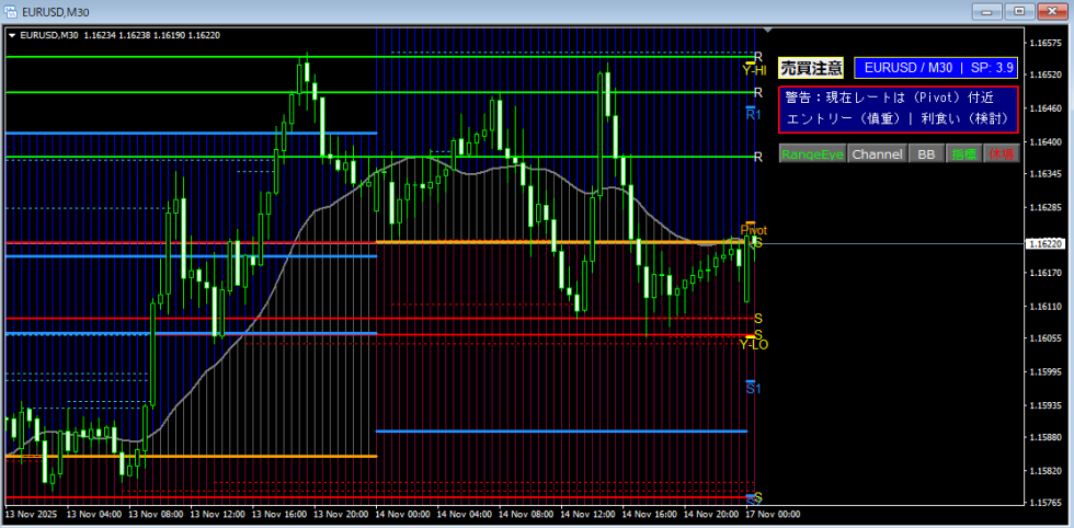 RangeEyeは「レンジ相場の視覚化」「トレンド方向の可視化」「ボラティリティ変化の捕捉」を同時に実現します。 これにより初心者の弱点である「レンジに翻弄されるミストレード」を防ぎ、 上級者にとっては「次のブレイクに乗るタイミング」を鋭く捉える武器となります。