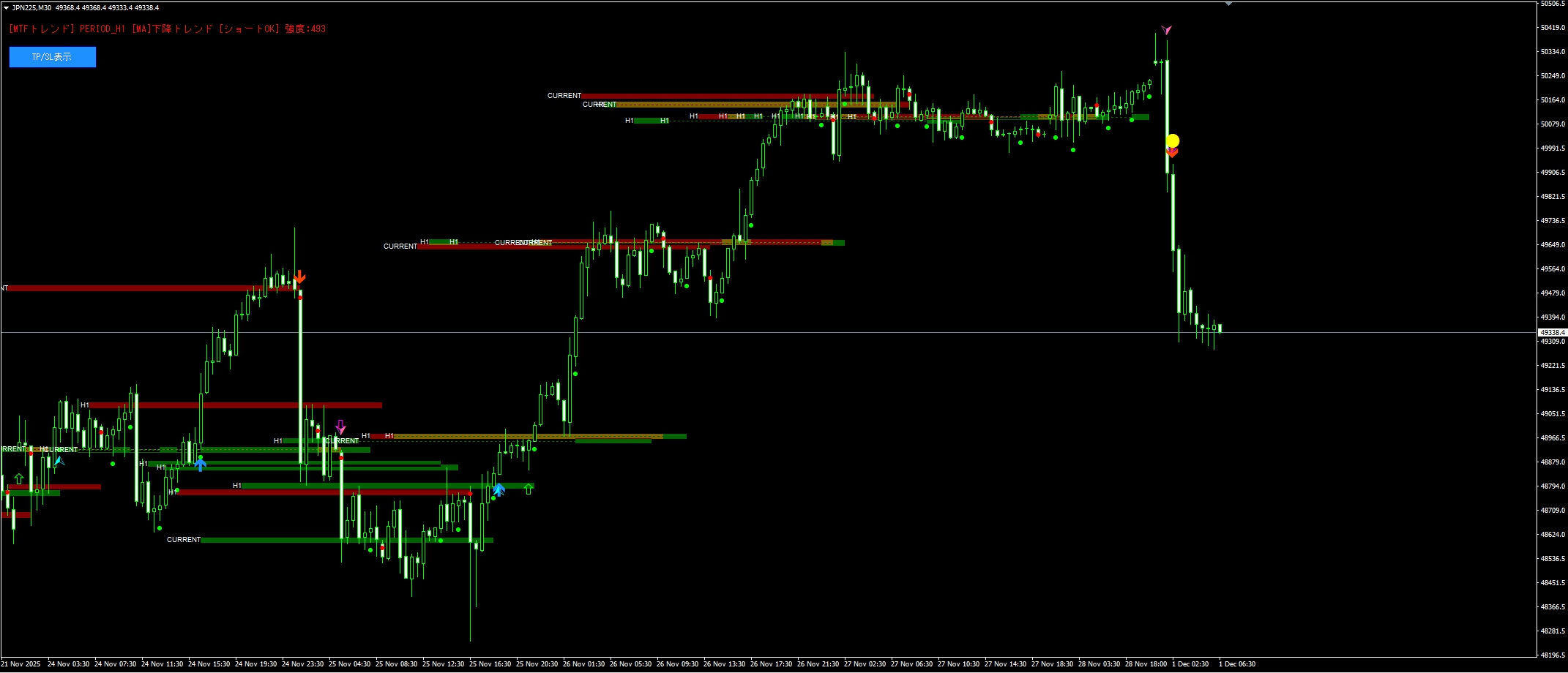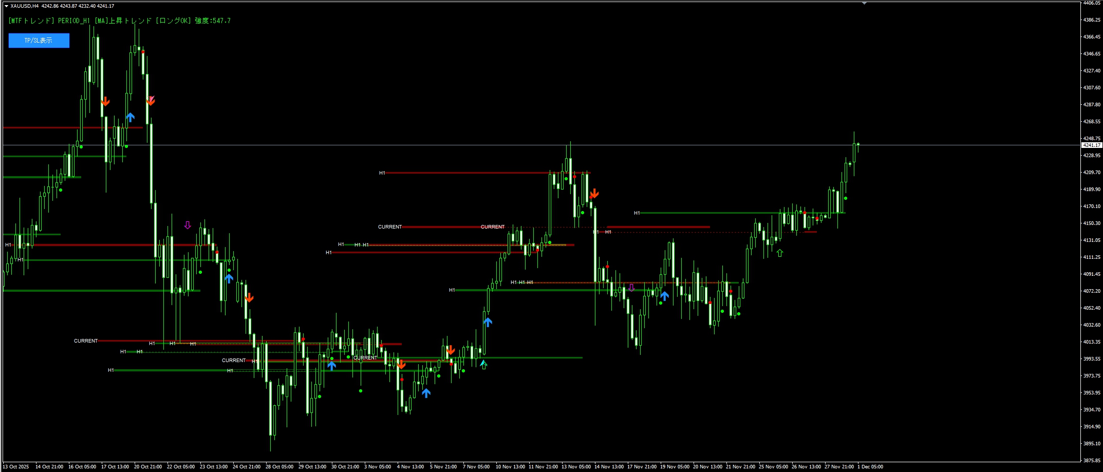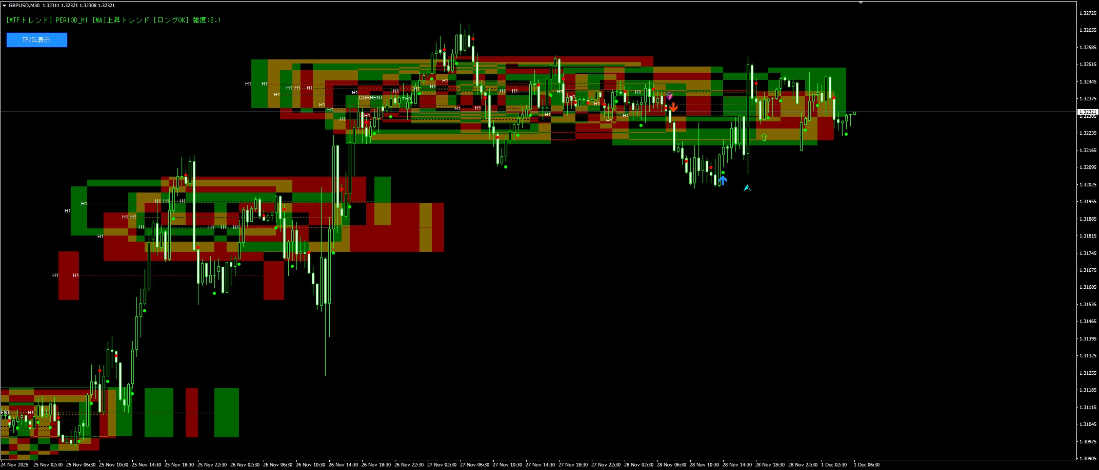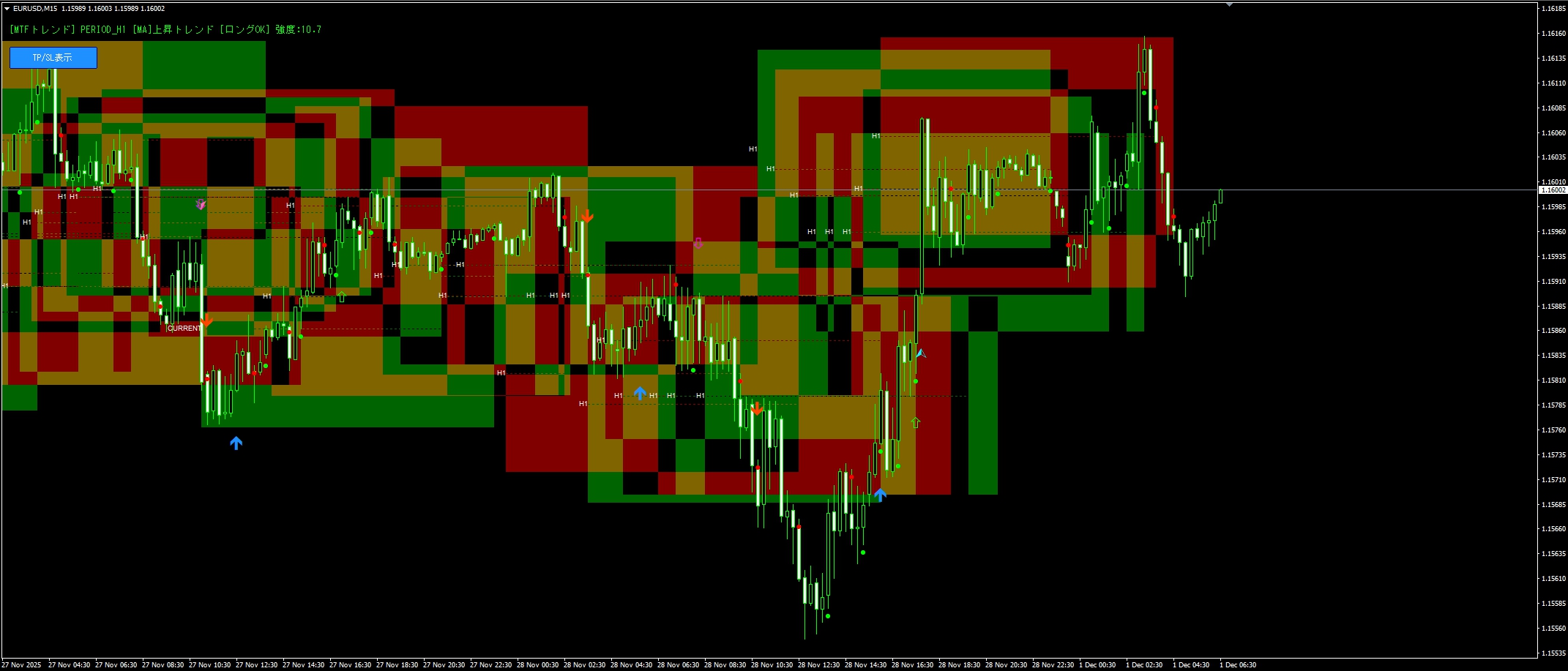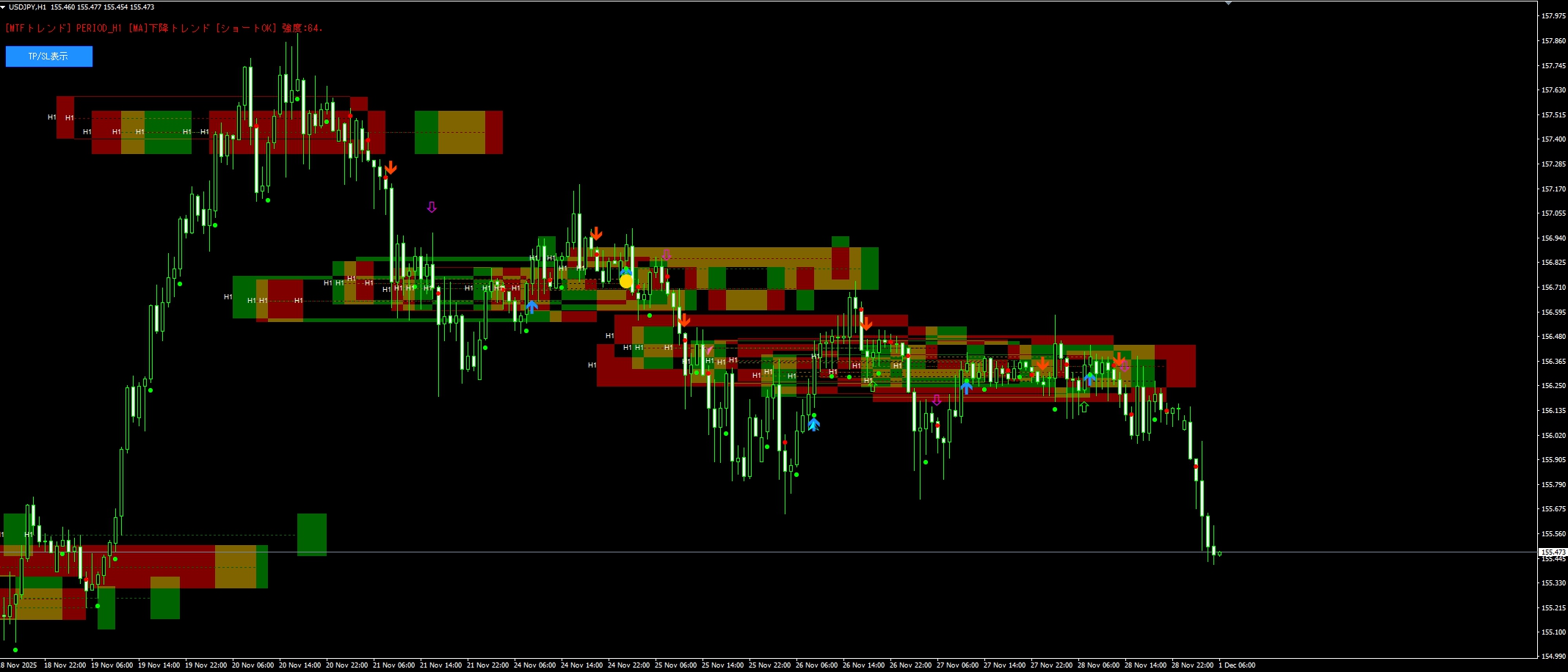 自動TP/SL表示ATRベースまたは固定pipsでの利確・損切りラインを自動表示リスク管理を自動化。感情的な判断を排除