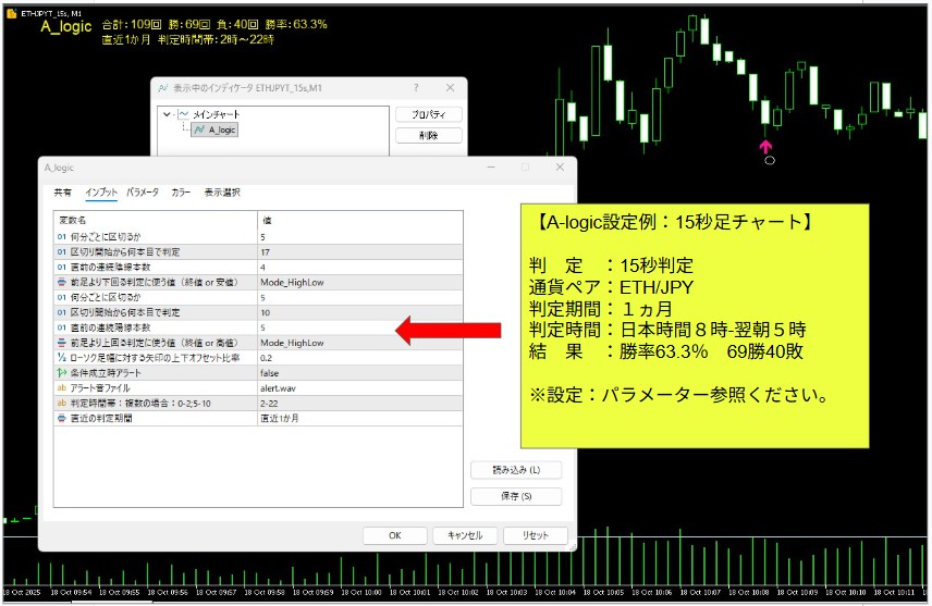 下記、無料ダウンロード可能EAによるお手軽形成した30秒チャートにA-logicを導入してパラメータを設定しました。