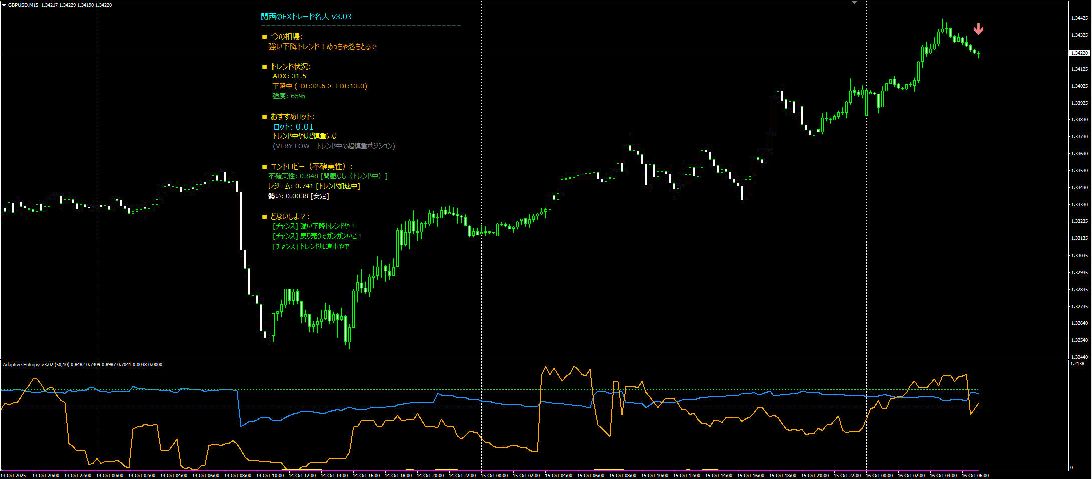 特長3. 2段階シグナルシステムを装備 暫定シグナル: リアルタイム表示(早期警戒) 確定シグナル: 絶対にリペイントしない(実トレード用)  "早期警戒とノンリペイント保証を同時実現"  初心者は確定のみ、上級者は両方活用可能するのがおすすめ。 競合との違い  リペイントするインジケーター → 信頼性に欠けます  ノンリペイントのみ → 遅すぎます  本システム → 両方を解決します 特長4. エントロピー勾配による先行指標 従来システムは、ATR等はボラティリティが起きた「後」に反応するのが普通です。 しかし本システムは、なんと!エントロピー変化率でボラティリティ爆発を「事前」検知 実際に、平均5-15分前に予兆を捉えます 変化率(微分)による先行指標システム 市場が動く前に察知する稀なツールとなっています 特長5. マルチタイムフレーム矛盾検出 上位足: トレンド 下位足: ノイズ → 自動で矛盾を警告します だまし回避率70%向上 時間軸の矛盾を自動検知、騙しを回避します 複数時間足を同時監視、整合性をチェック 上位足と下位足の乖離を可視化します 特長6. 市場レジーム自動判定 TRENDING / RANGING / CHAOTIC を自動分類 各レジームに最適な戦略を推奨 市場状態を3分類、最適戦略を提案します トレンド・レンジ・混沌を自動識別 相場環境に応じた戦略推奨システム