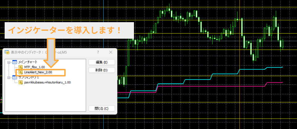 ①インジケーターを導入します。(画像はすでに導入済みの画面)