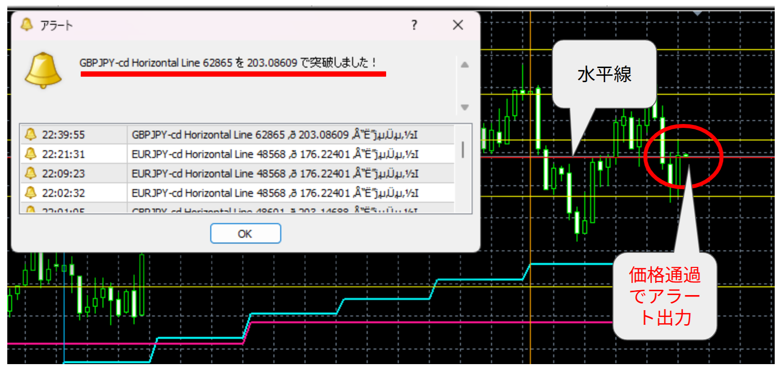 ※Bid価格がラインをまたいだ瞬間に検知します。