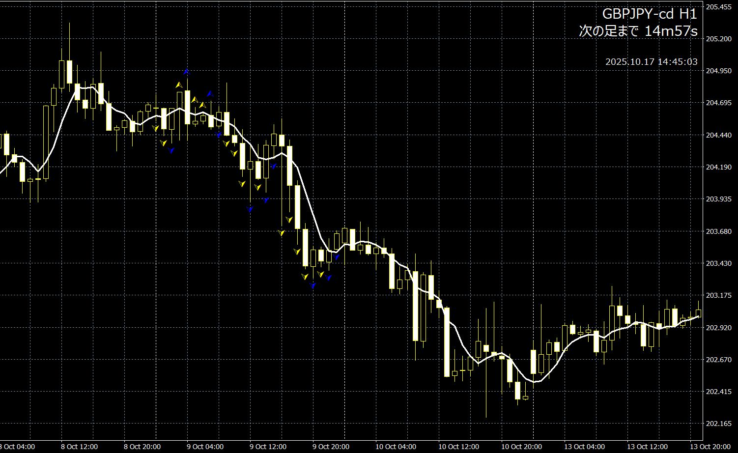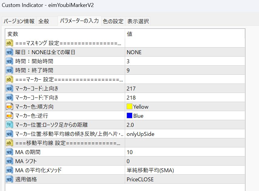 - マーカー表示位置は以下の2パターンから選択 - 常にローソク足の上側 - 移動平均線が右肩上がりの時はローソク足の上側、右肩下がりの時はローソク足の下側