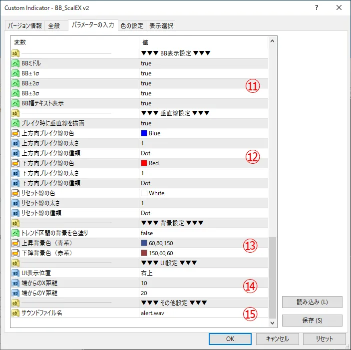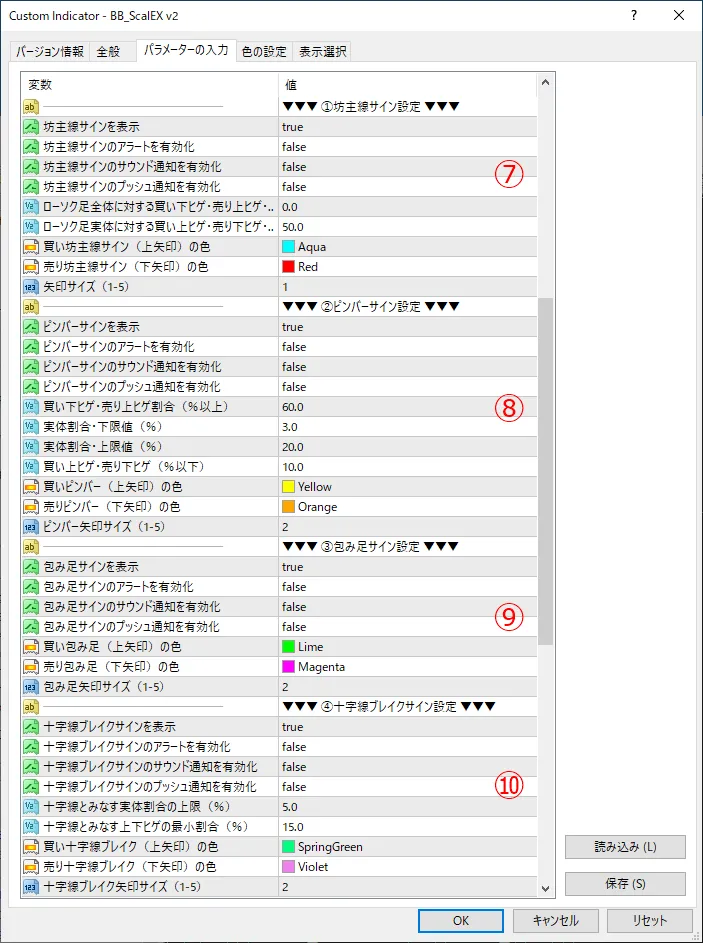 主要な数値(トレンド判定やサイン発生条件など)はパラメータで調整可能です。