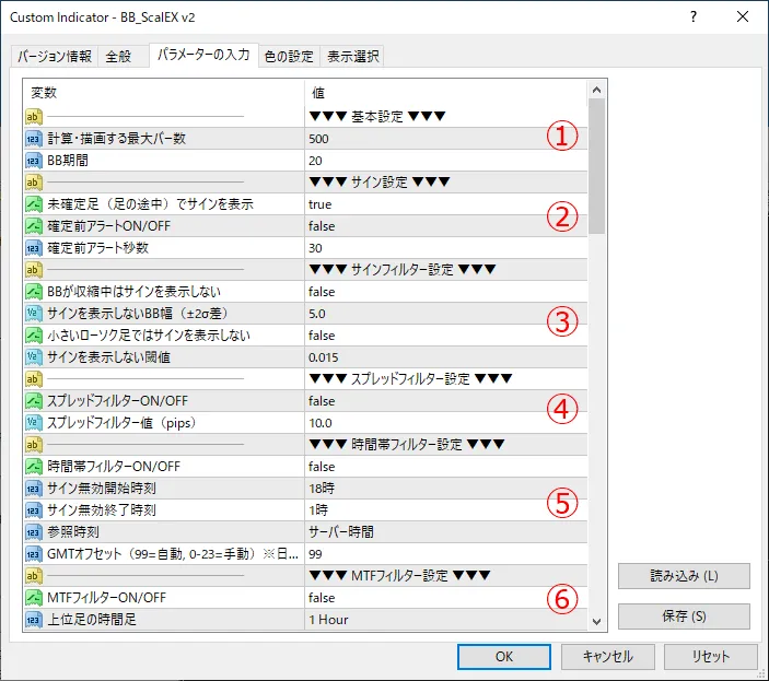 - 5種類のフィルター機能搭載(BB幅・ローソク足サイズ・スプレッド・時間帯・MTF)