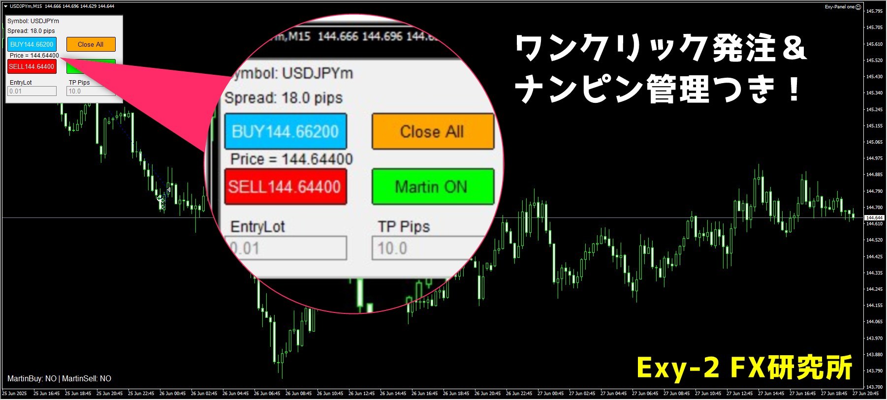 本商品は、裁量トレーダーの判断力を活かしながら、ナンピン・利確・損切・建値移動などの一連の操作を自動化できる、ハイブリッド型のトレード補助EA「エクシー・パネル・ワン」の無料お試し版です。