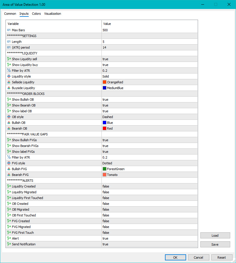 流動性ゾーン:ストップオーダーが蓄積されやすい等値の高値/安値のクラスターと流動性プールを検出します。オーダーブロック:市場構造と取引量の変化に基づいて、潜在的な強気・弱気のオーダーブロックをハイライトします。フェアバリュギャップ(FVG):市場がトレンドを継続する前にリバランスへ戻る可能性のある価格の非効率を特定します。カスタマイズ可能な可視化:各エリアタイプの色、不透明度、および表示スタイルを調整できます。アラートシステム:価格が重要な価値エリアに接触するか、突破した場合に通知します。