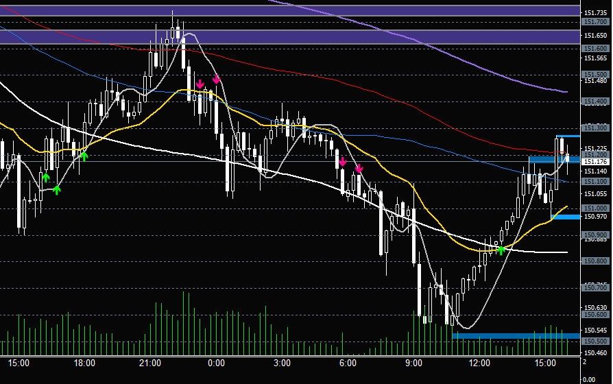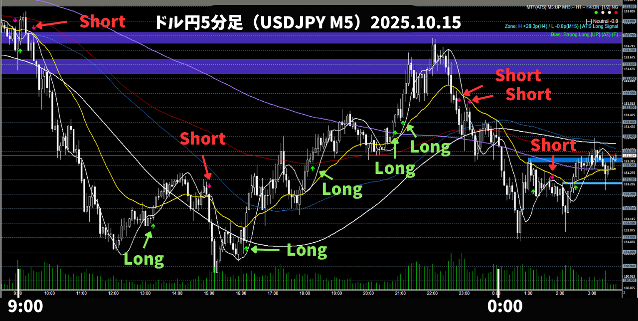 2025年10月15日(水曜日)の午前9時から16日午前3時あたりまでのドル円5分足のチャートです。