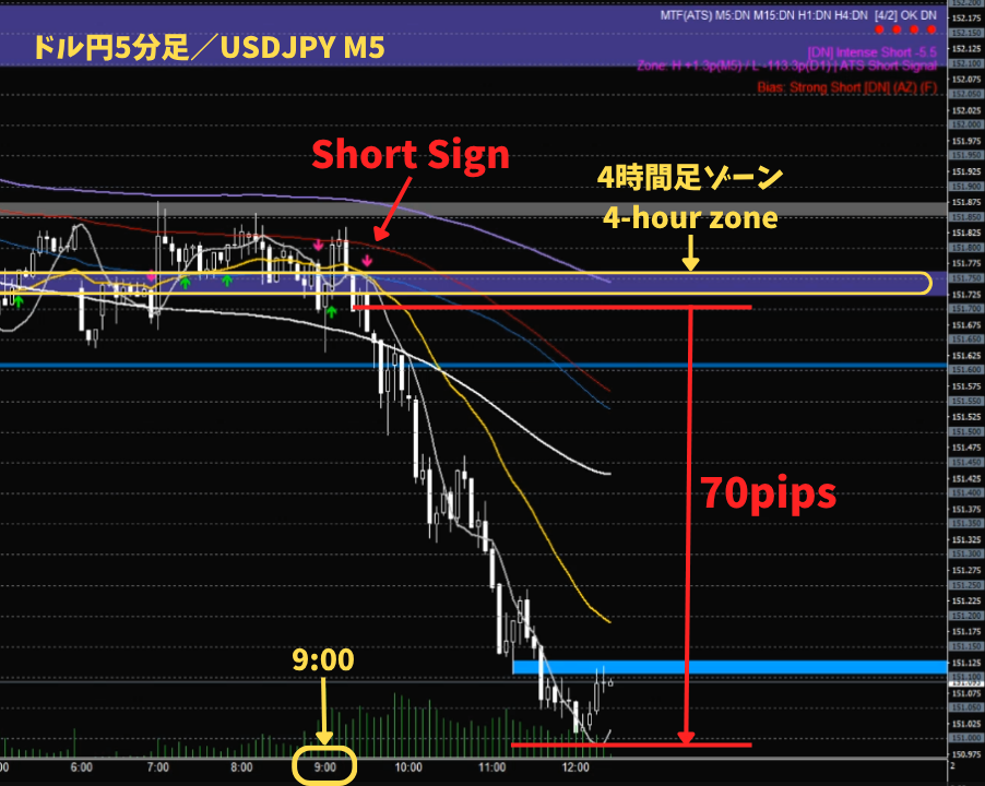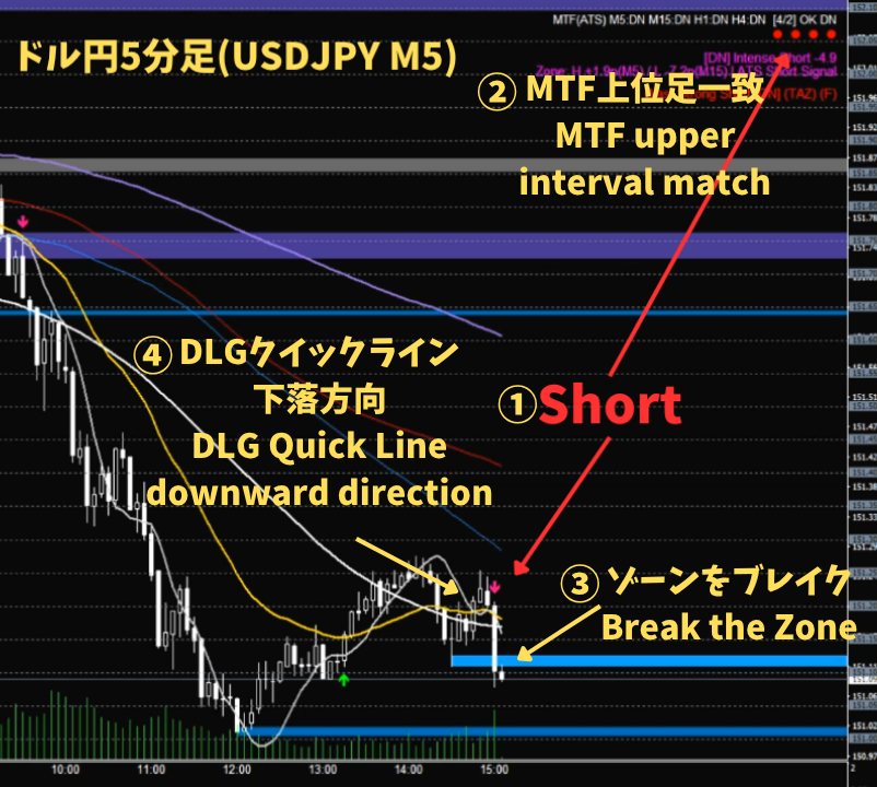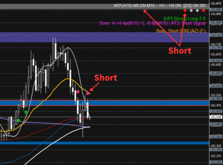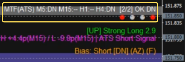 ②MTFダッシュボードの上位足のドット色がDRTショートサイン(矢印)と同じ下方向