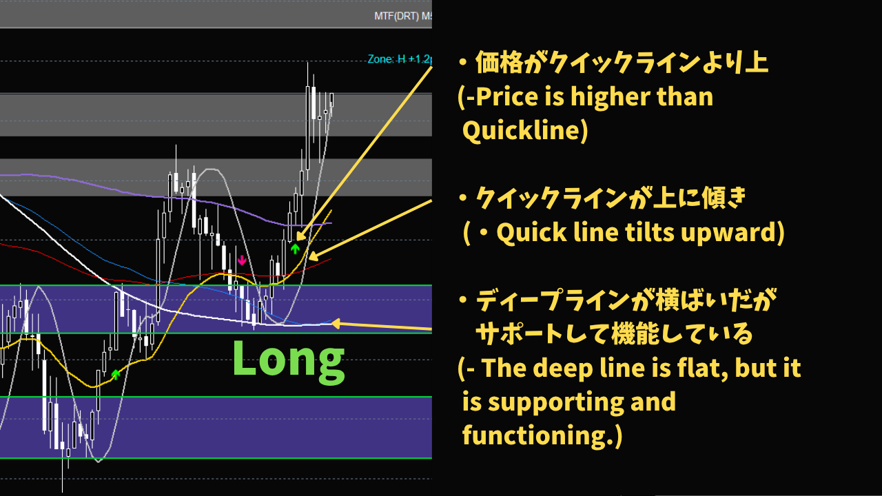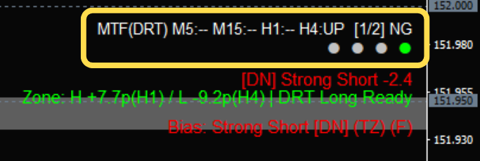 MTFダッシュボードがOK(ドット2つ以上が同色点灯)で、DRTサインとDLGクイックラインが同方向ならエントリーの準備。