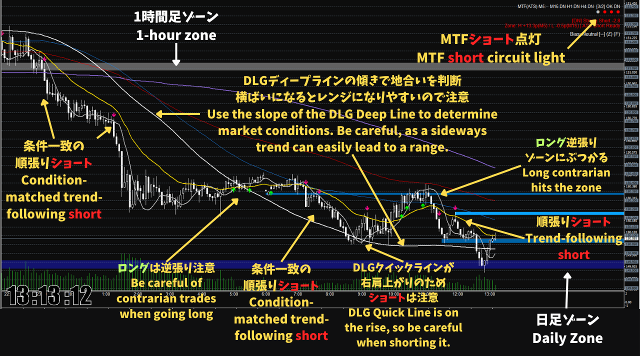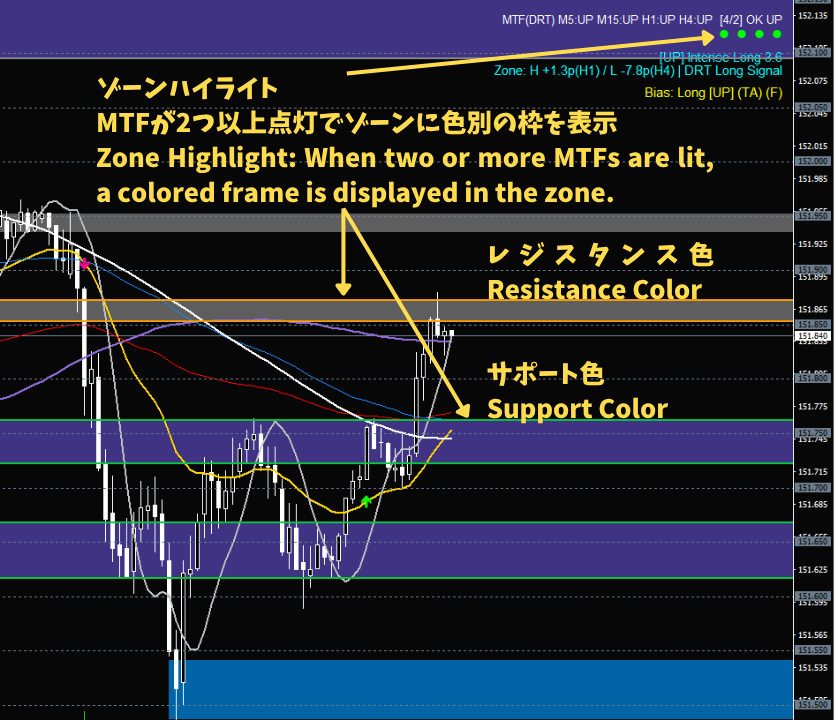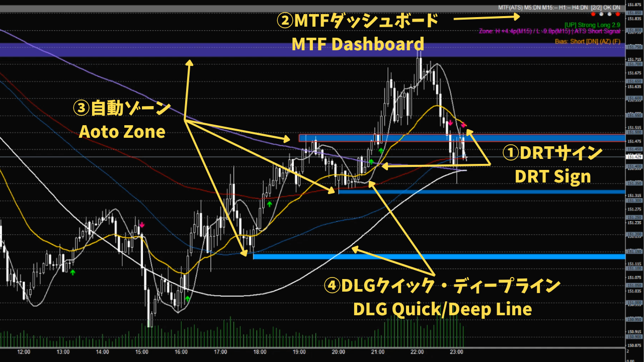 ①サイン(矢印)を起点に、②MTF(マルチタイムフレーム)一致、③自動ゾーン距離、④DLGラインといった機能が同じ方向のときだけエントリーを狙います。