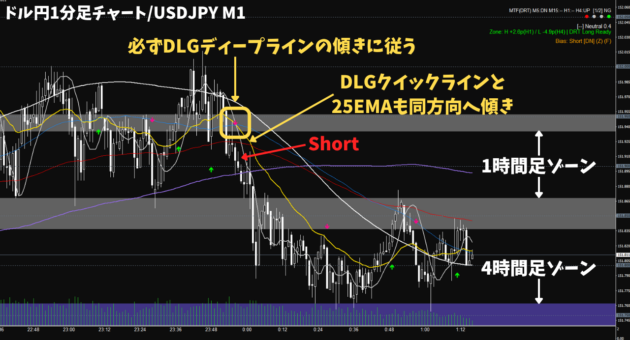 もし1分足でスキャルピングをされる場合は、4つの条件一致はもちろんなのですが、DLGディープラインの傾きで地合い(相場の方向性)を確認しながら(1分足でも効きます)、クイックラインと25EMAの傾きに従ってDRTサインが出たときに狙う、などのトレード条件をキツめにして試してみてください。