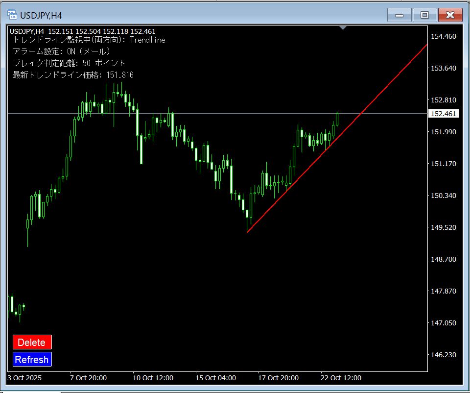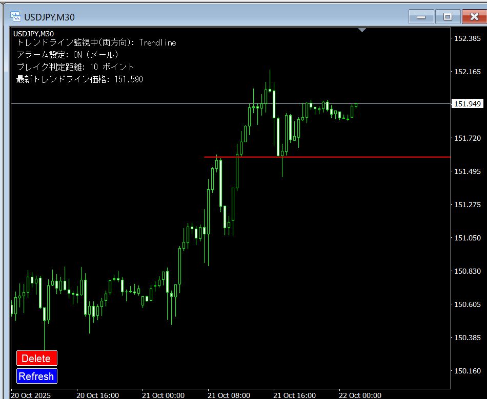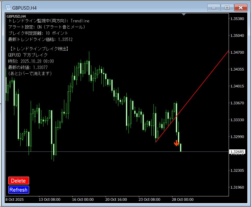 ・本インジケーターのコメントを次の終値が確定するまで消去するDeleteボタンと更新のためのRefreshボタンを搭載