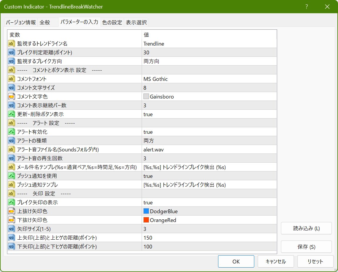 TrendlineBreakWatcherはトレンドラインをローソク足の終値がまたいだ時点(ローソク足の確定時点)でお知らせするインジケーターです。 特徴 ・アラート動作のタイミングをローソク足が上に抜けた時、下に抜けた時、両方、の3つから設定できます ・トレンドラインを抜けたと判定する閾値をpointで設定可能です (point = チャートに表示されている価格の最小桁) ・トレンドラインを抜けているが閾値以下でアラートが鳴らなかった場合でも、 次の足の終値がトレンドラインを抜けた側にある場合はアラートが鳴ります(ブレイクの見逃し防止) ・ブレイク判定時にお知らせするアラート機能のオンオフ、メール送信機能も搭載(MT4のメール送信機能を使用)