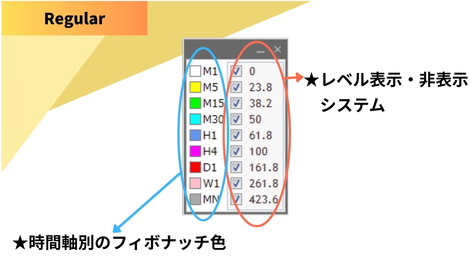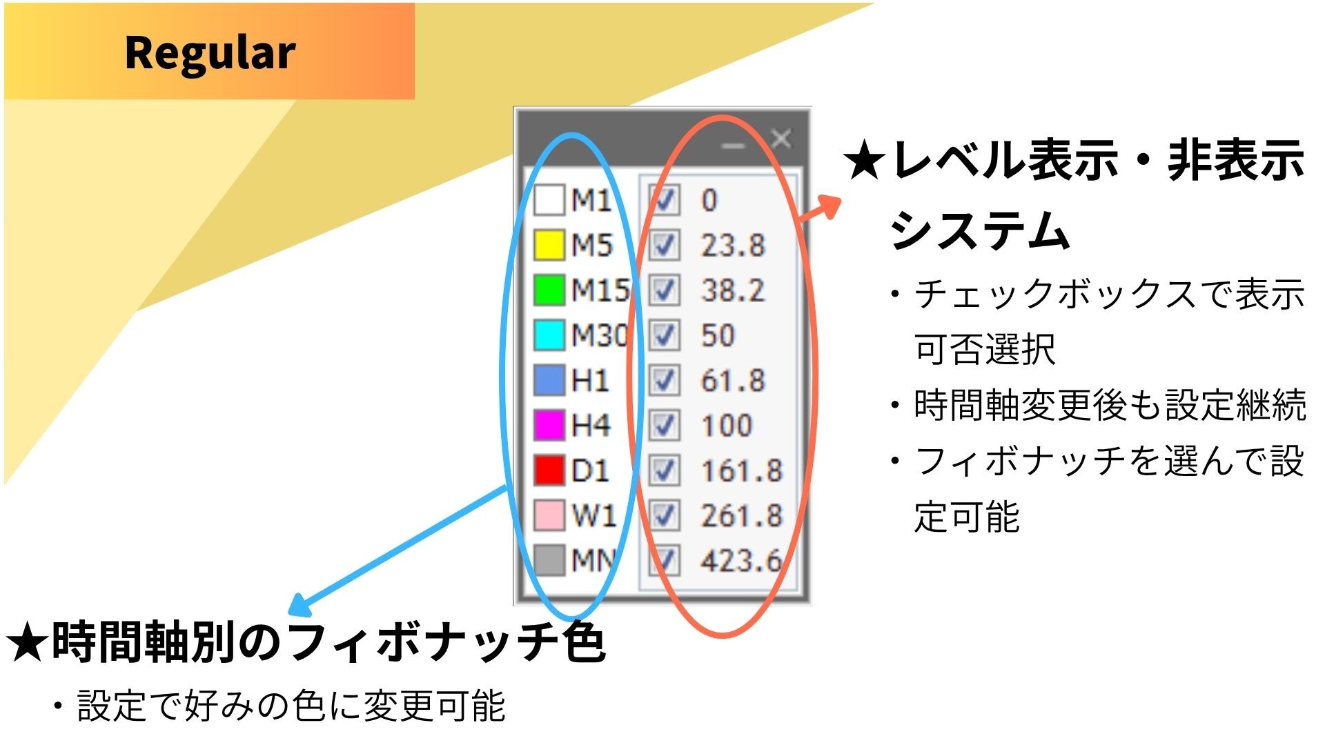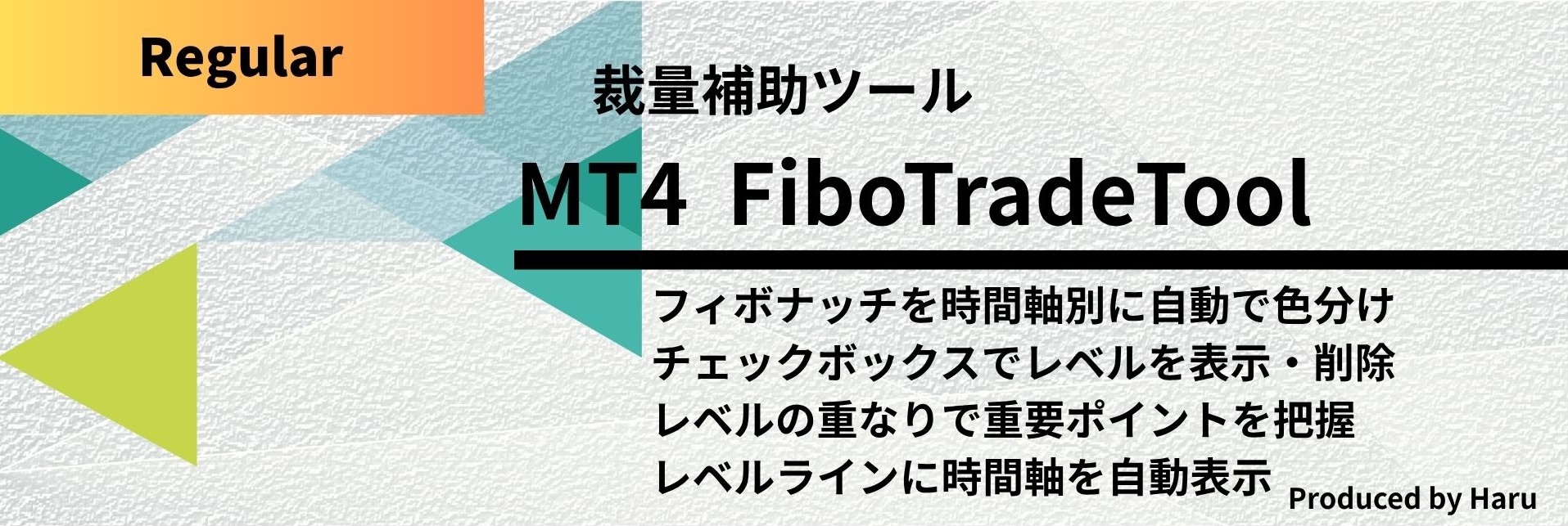 MT4【裁量補助ツール】フィボナッチを時間軸で色分け&レベル表示選択機能【FiboTradeToolRegular】Grade:Regular