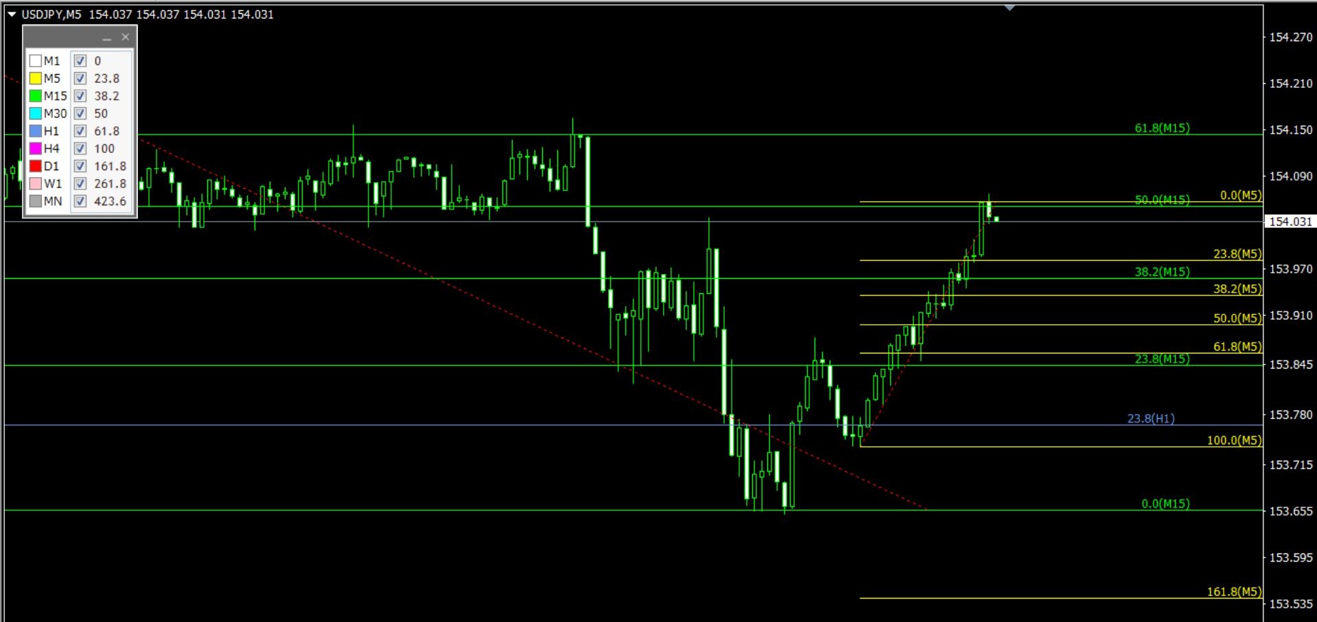時間軸変更後も色は保持されるため、複数時間軸でのフィボナッチ分析がより分かりやすくなります。