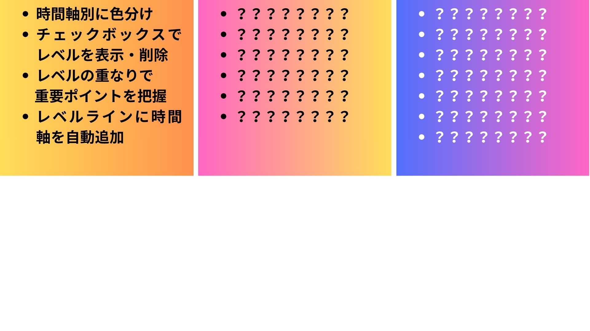 画像のように、時間軸別に色分け・表示した時間軸が各レベルラインに表示されます。