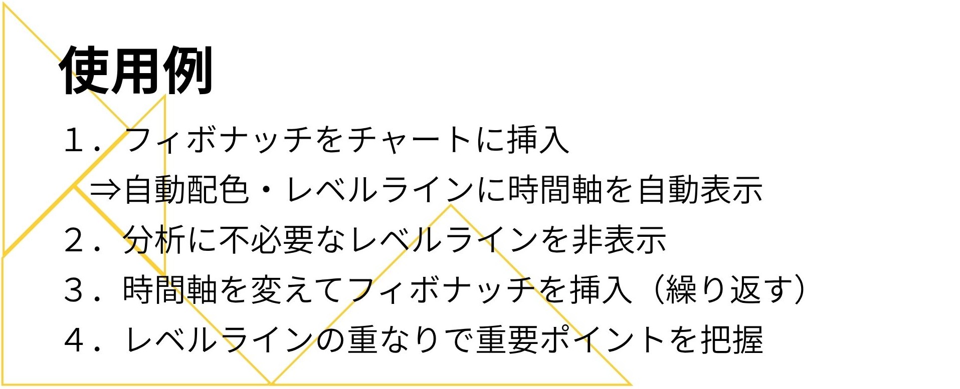 どの時間軸のフィボナッチかが一目見てわかるため、強い抵抗帯等が分かりやすくなります。