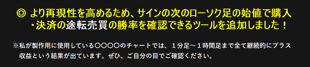 ★ ただし、次のローソク足の始値でエントリーのツールは、短期的にはマイナスとなることもありますので、あくまで検証用として利用し、実トレードには使用しないでください。(5分足以上では比較的優位性がありますので、サイン通り取引について安心感を得られるメリットがあるため、検証用ツールを提供しています。)このシステムは、基本的にサインが出たら、即エントリーの取引に最適化しています。
