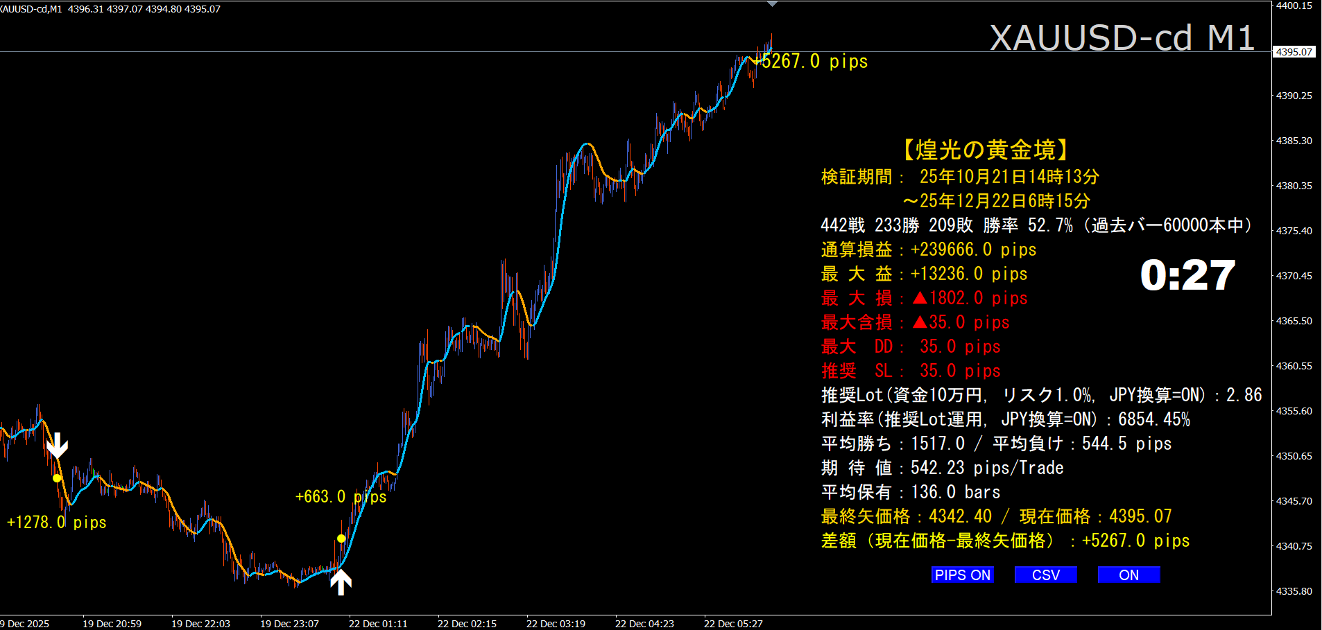 今まで提供してきたものも、少し工夫をすれば利益を得られるもので、感謝の言葉を頂いたことも多くあります。しかし、もっとできるはずだ、きっとできるはずだという思いが強く、挑戦を続けてきました。その結果、やっと、やっとですが、これならというものが出来上がりました。このシステムも、発売当初から初めて利益が出るようになったという好意的なご意見を多くいただきましたが、率直に言って、まだまだ不満でした。こんなものじゃないという思いが頭から離れませんでした。 で、その壁を越えられず、発売以降も挑戦を続けていましたが、それがつい最近、ほんの1週間ほど前ですが、ストンと腑に落ちたのです。ああ、そうだったのかという思いがこみ上げてきました。計算上安定して60%前後の勝率が出るもの、当然それに伴った利益が期待できるものです。このシステムの完成には、別売の黄金の紋章で培った技術の積み重ねがありました。それとの相互作用で、このゴールド取引に特化したシステムが出来上がったのです。