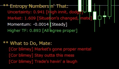 特長3. 2段階シグナルシステムを装備 暫定シグナル: リアルタイム表示(早期警戒) 確定シグナル: 絶対にリペイントしない(実トレード用) "早期警戒とノンリペイント保証を同時実現" 初心者は確定のみ、上級者は両方活用可能するのがおすすめ。 競合との違い リペイントするインジケーター → 信頼性に欠けます ノンリペイントのみ → 遅すぎます 本システム → 両方を解決します 特長4. エントロピー勾配による先行指標 従来システムは、ATR等はボラティリティが起きた「後」に反応するのが普通です。 しかし本システムは、なんと!エントロピー変化率でボラティリティ爆発を「事前」検知 実際に、平均5-15分前に予兆を捉えます 変化率(微分)による先行指標システム 市場が動く前に察知する稀なツールとなっています 特長5. マルチタイムフレーム矛盾検出 上位足: トレンド 下位足: ノイズ → 自動で矛盾を警告します だまし回避率70%向上 時間軸の矛盾を自動検知、騙しを回避します 複数時間足を同時監視、整合性をチェック 上位足と下位足の乖離を可視化します 特長6. 市場レジーム自動判定 TRENDING / RANGING / CHAOTIC を自動分類 各レジームに最適な戦略を推奨 市場状態を3分類、最適戦略を提案します トレンド・レンジ・混沌を自動識別 相場環境に応じた戦略推奨システム